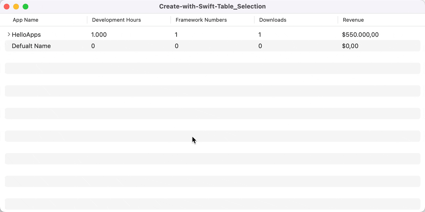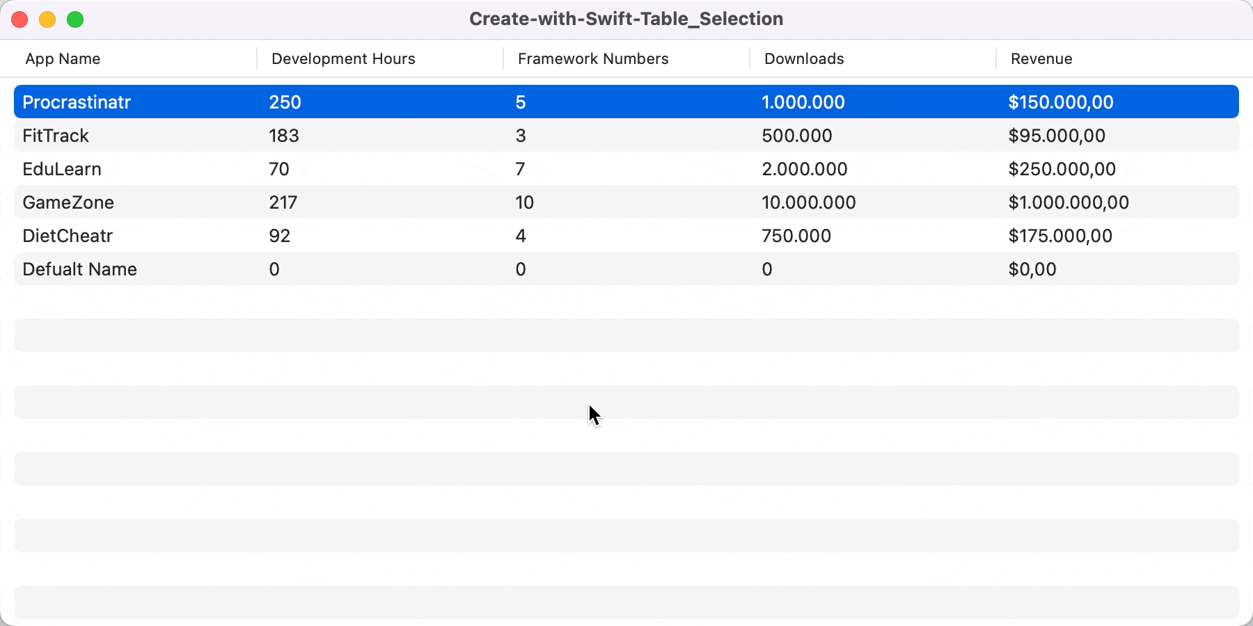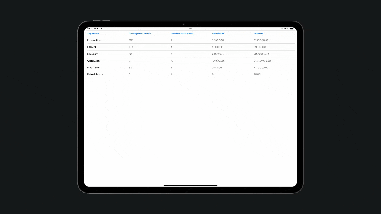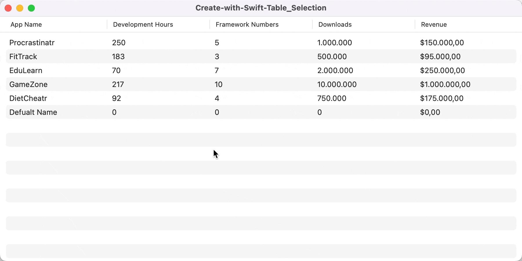 TableRow(Project(appName: "Default Name", developmentHours: 0, frameworkNumbers: 0, downloads: 0, revenue: 0))
