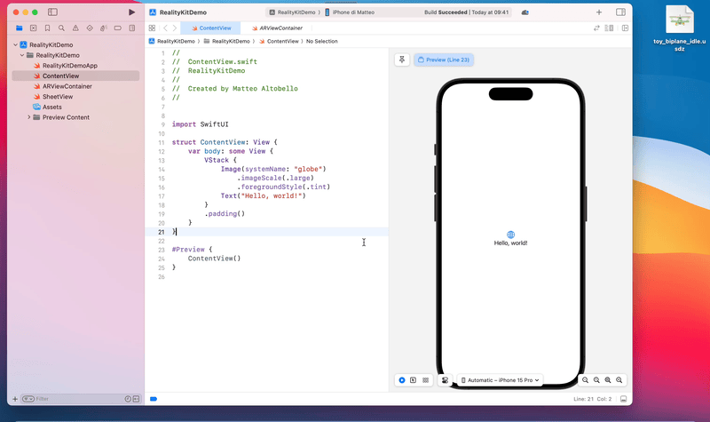 First of all, we need to download our .usdzmodels model. Fortunately, Apple has a list of free models that you can easily download here. For this project, we will use the model called toy_biplane_idle.usdzand don’t forget to also download the image linked to the model and move it into the Assets folder (we will need it for our basic UI).