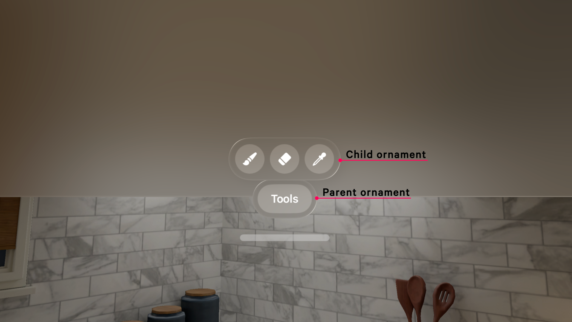 An Ornament is a two-dimensional interface component that sticks on a plane parallel to its associated window, slightly in front of it, always keeping the same relative position. It ensures that while your user is navigating your app, crucial information, like status updates, or critical actions are always accessible where the user expects them to be, without getting in the way of your app's content.