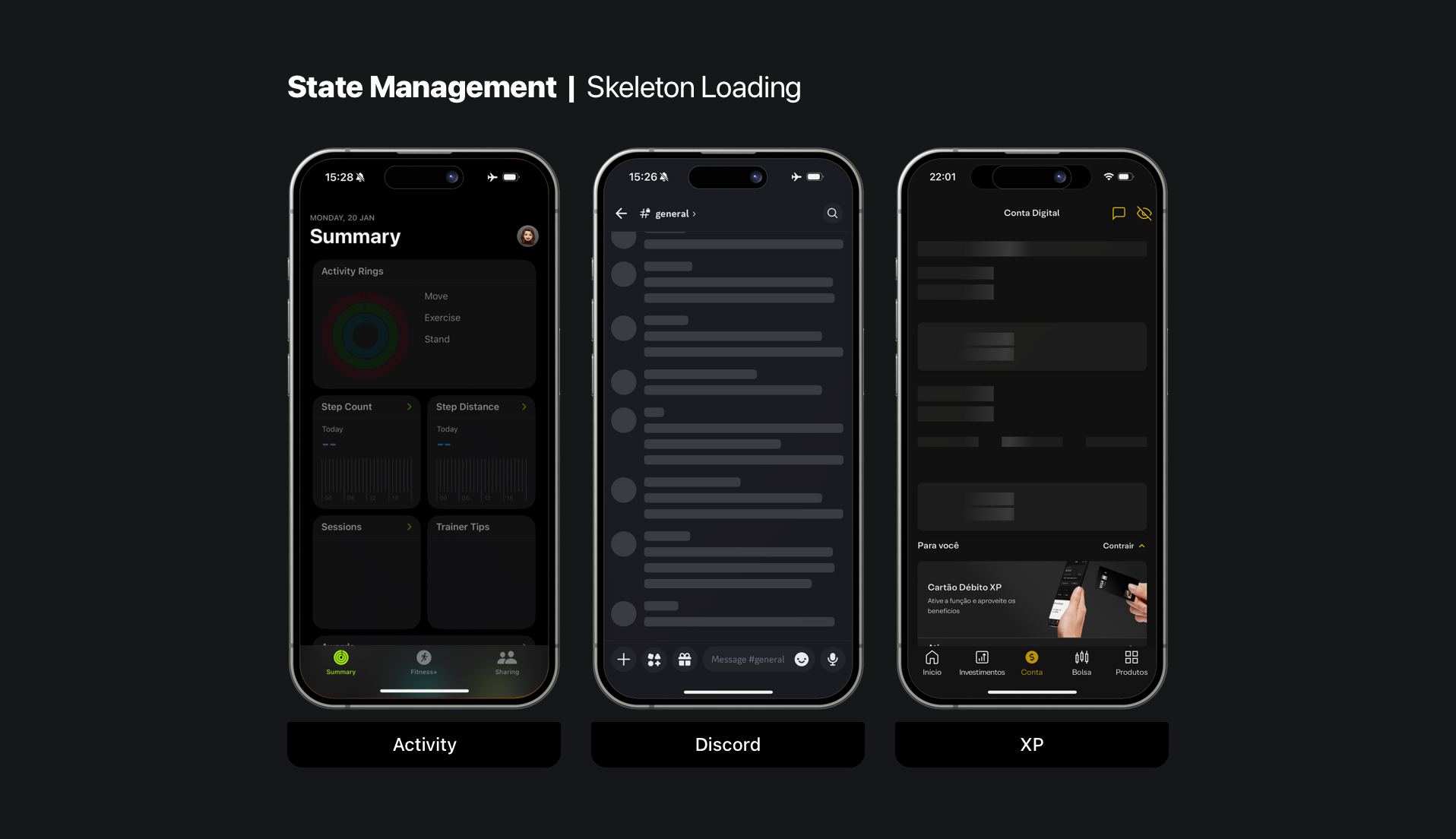 A skeleton outlines areas where the content will eventually appear, acting as a placeholder until the data is fully loaded. By offering a visual preview, skeleton screens help manage user expectations and make content loading feel smoother. This is especially helpful when an app fetches data from multiple sources. Common elements that can benefit from a skeleton include images, cards, charts, lists, tables, and text.