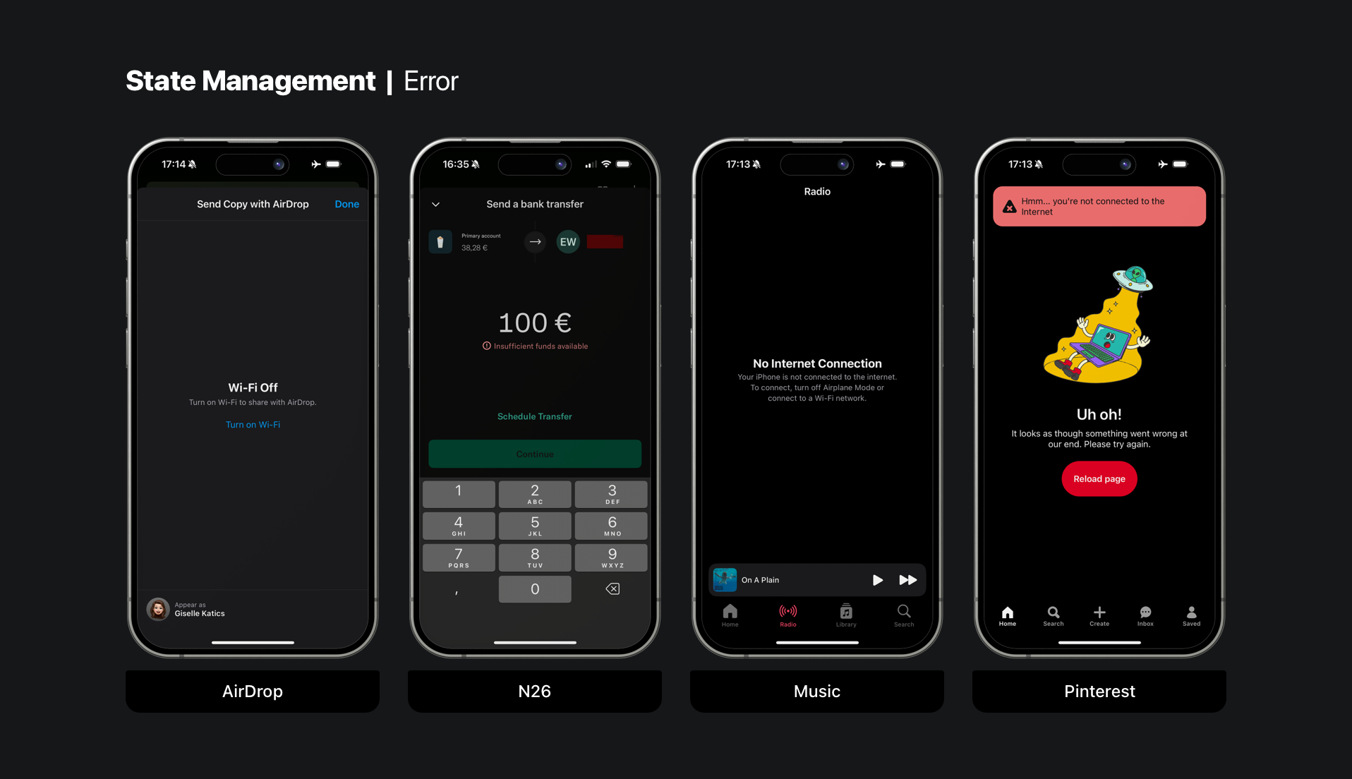 Is the state of "things went bad". It is more complex than a single screen, as errors can happen in unexpected combinations. These may range from missing, or incorrect, data in an input field to server connection failures. The app should always protect user data and clearly communicate any problem. Keeping users informed is crucial, especially in critical situations like a failed banking transfer –did the money move between accounts or not?