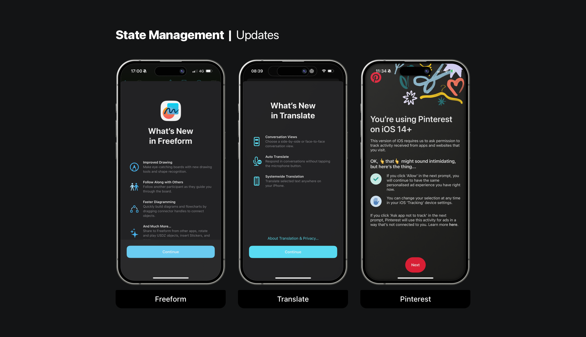 This state is to celebrate that the app received a major update with exciting new features for users. This experience resembles onboarding but is specifically designed for returning users. It appears immediately when the app is opened and should be brief to avoid disrupting the user journey. Avoid using this feature to communicate bug-fix updates.