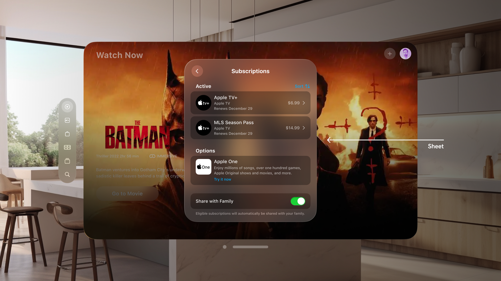 Sheets in visionOS manifest as modal views at the center of the app, presenting simple tasks or information, using the same Z-position as the parent window. The parent window pushes back and dims, temporarily suspending interaction with the parent view until the sheet is dismissed.