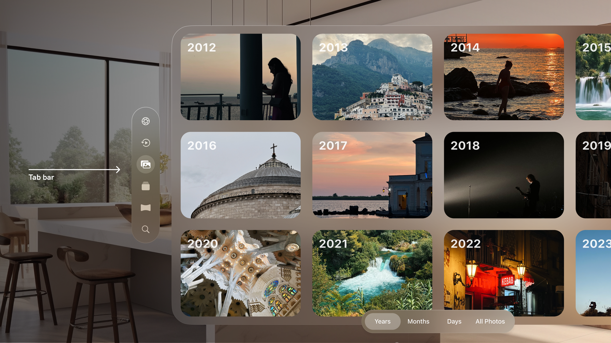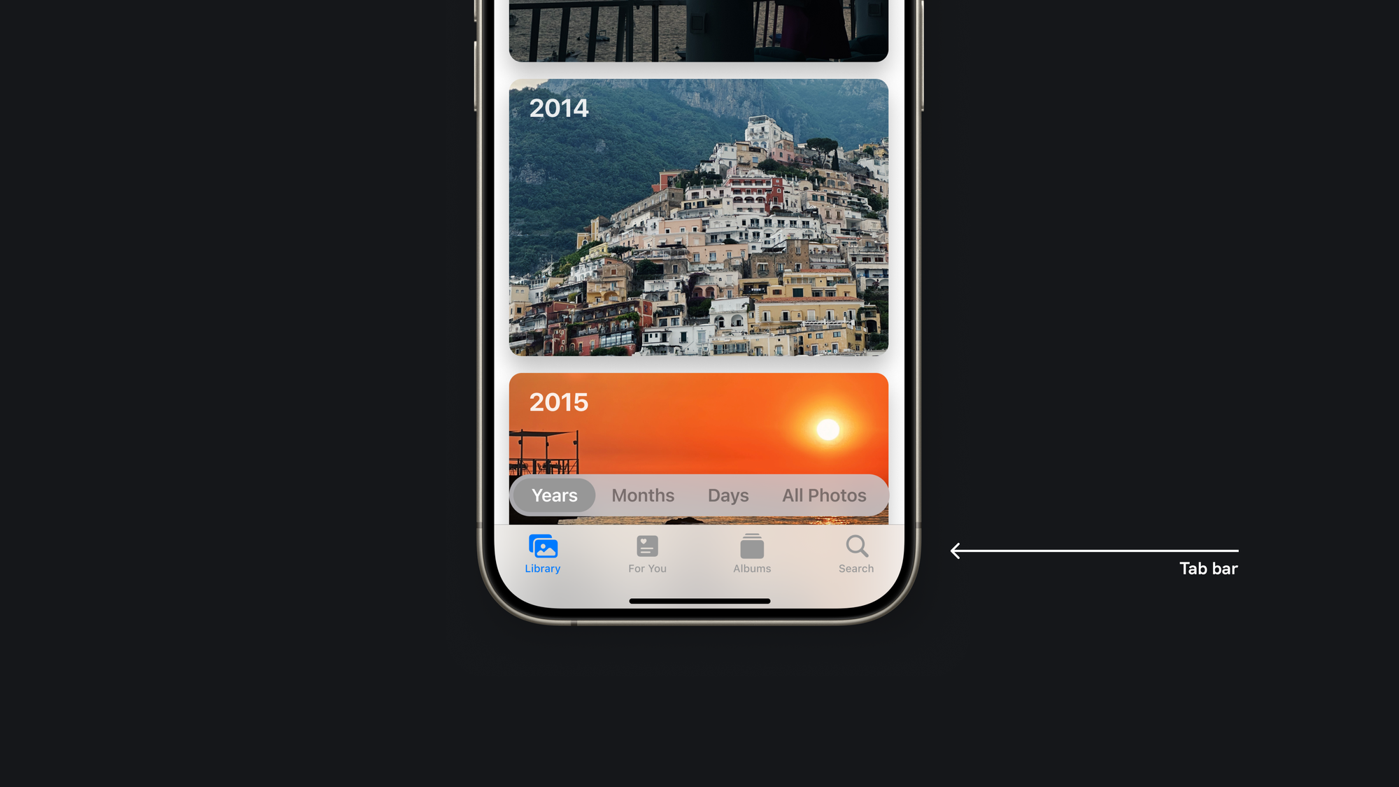 This element is versatile: in the Photos app, the ornament helps users navigate between years, months, and days. In the Music and TV apps, the ornament assists users in controlling their music and video playback.
