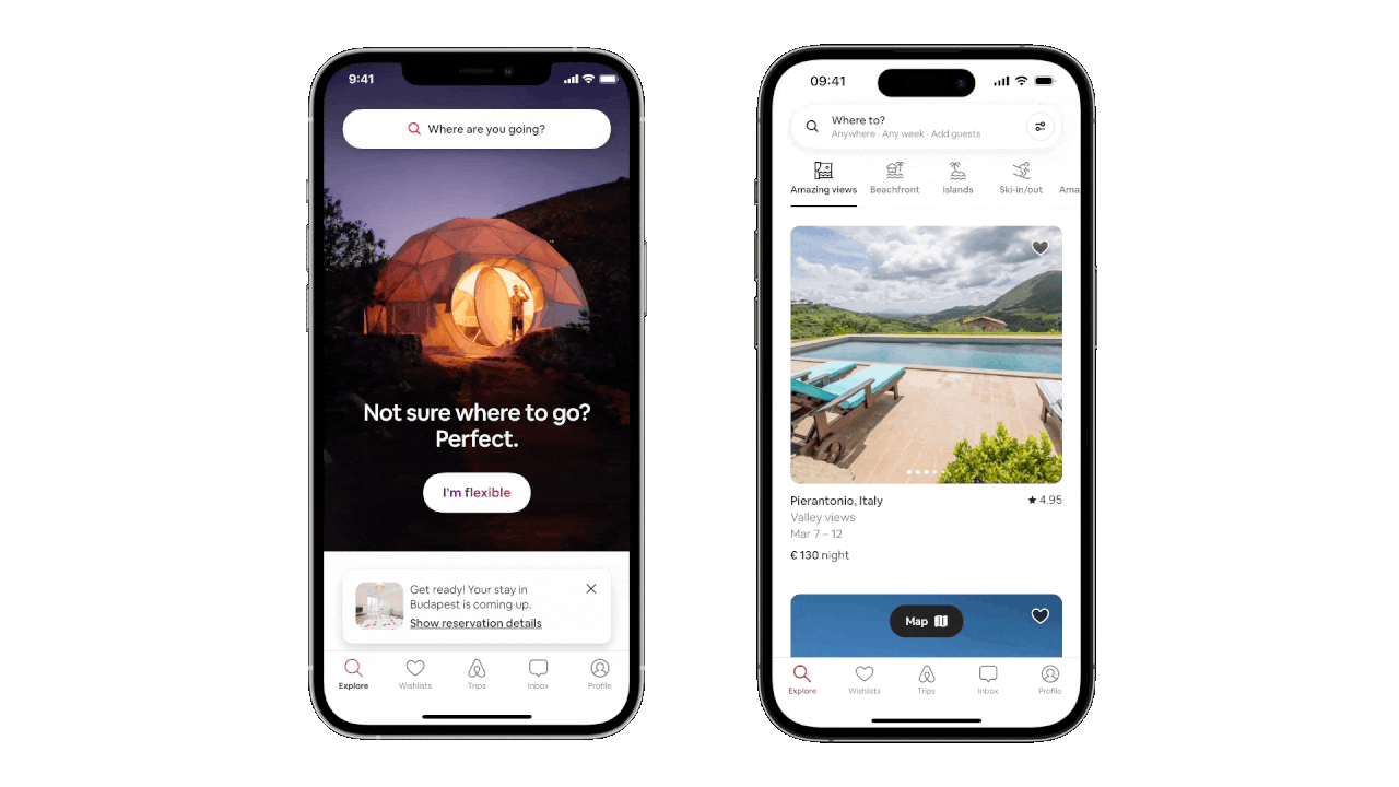 The principle of consistency is central to UI design, and it also applies to micro-interactions. The same animation or visual effect should be used for the same action throughout the interface. For example, in a previous version of Airbnb, when the user tapped the search bar, a circle expanded, but when the user tapped the back button, a modal view closed. This is an unexpected behavior since we have two different transitions related to the search bar. Fortunately, Airbnb updated the app to create a consistent transition from the search bar back to the main screen.
