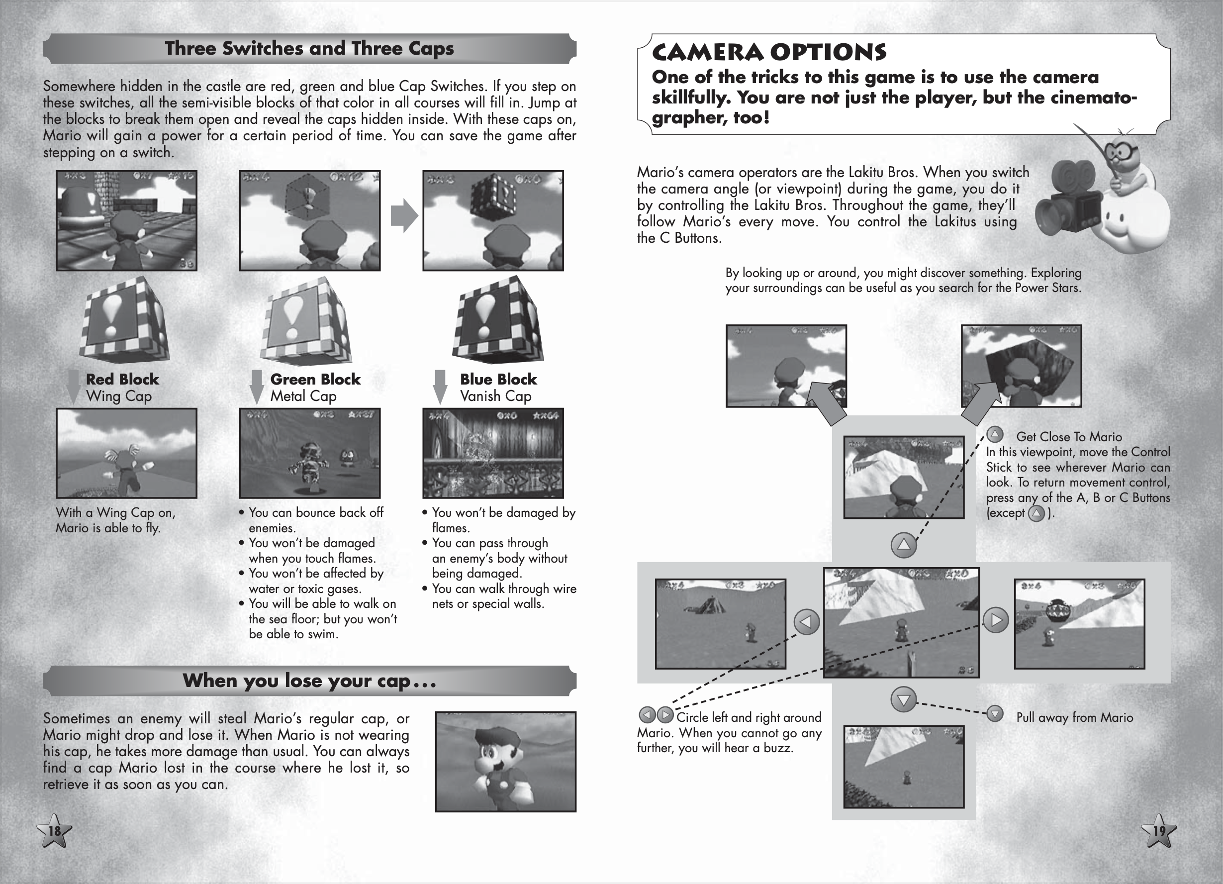 The game must remain fun to play" (Mielke 1998). To address this problem, Miyamoto turned to cinema. Miyamoto has been very careful to explain that he doesn't create cinema on the game console. He sees cinema as passive whereas games are active. However, he has explained that game designers can borrow good ideas from movies, such as camera angles and real-time voices ("Mr. Miyamoto on Star Fox" 1997, 118), and he sees Star Fox 64 (Nintendo 1997) as an example of what an interactive movie might be. He explained, "Since I have been working on 3-D games, I have begun to specify camera angles, locations and movement" (Nintendo 1997). And he deftly manages this in his Super Mario 64 by offering two types of camera control: automatic control to provide "a recommended view" (sometimes the game takes control and offers this when approaching enemies or challenges) and player control, enabling everyone to be “cinematographers."