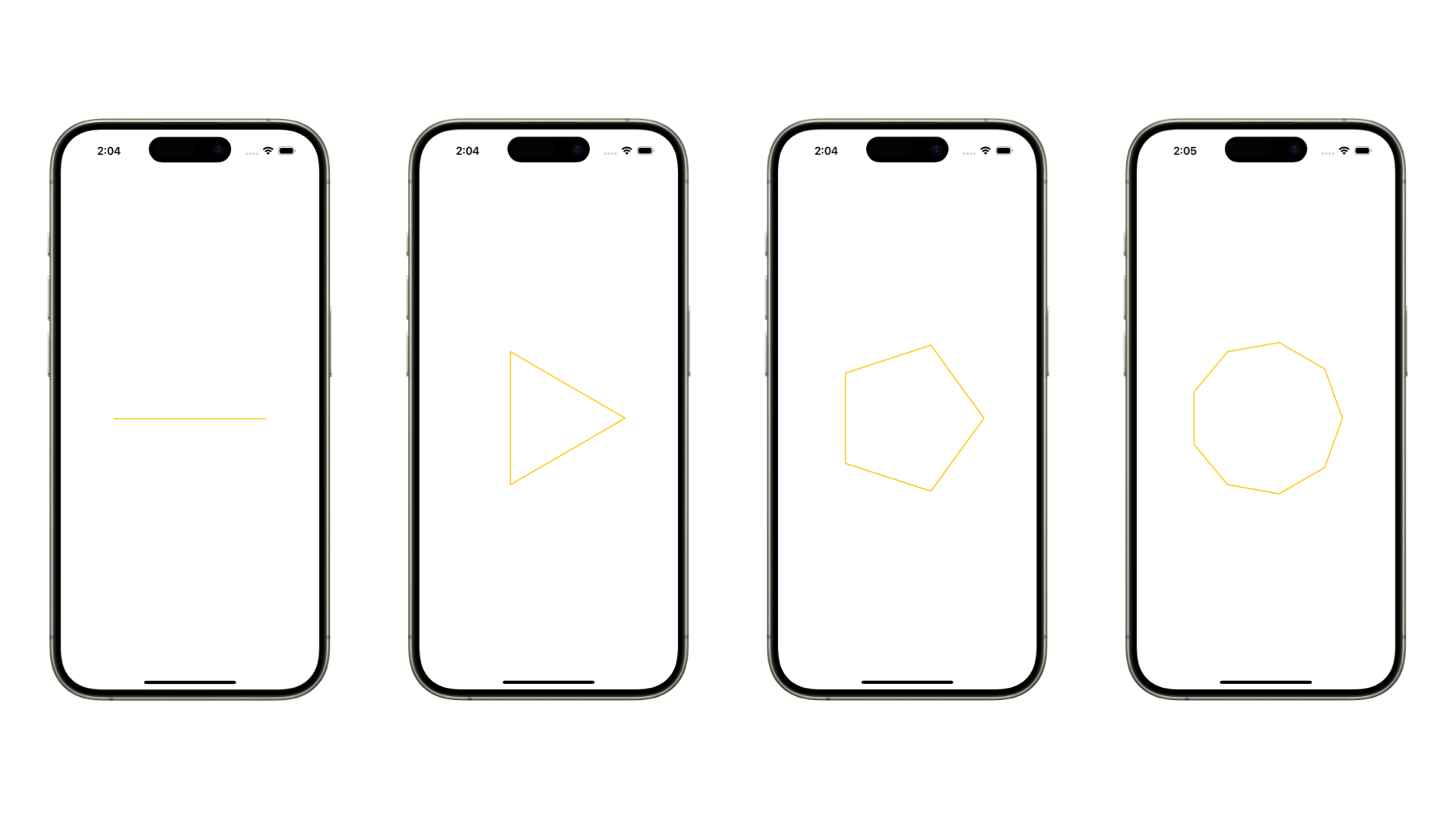 To start drawing using Canvas, it’s better to create a custom shape model where all the properties are stored: the number of points the path should consist of, the stroke width and its color, and the background color. The more properties defined, the more differentiation can be created. Playing around with these properties allows you to create variations of the same custom path. In the example above, four variations of the same custom shape have been made by changing the number of control points of a Path object.