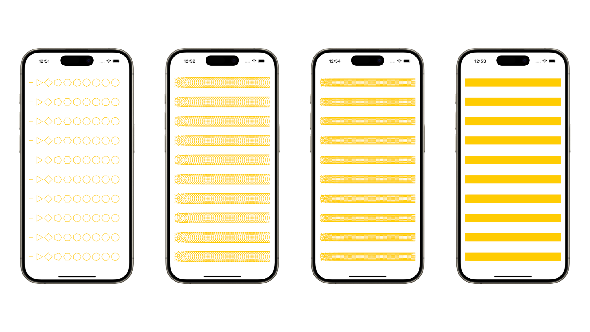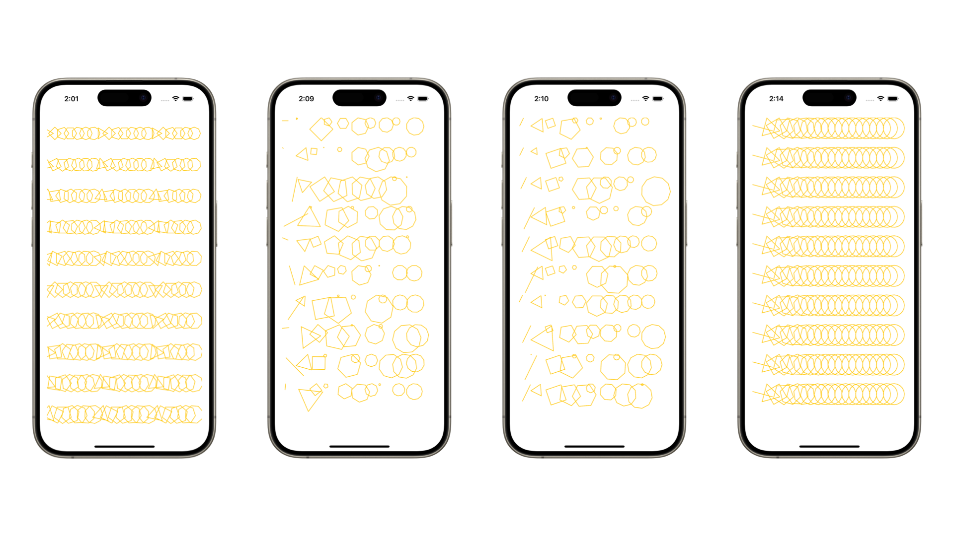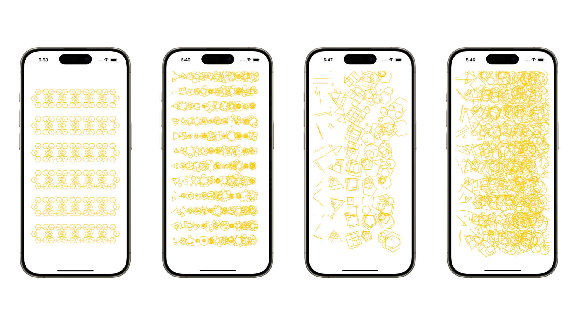 To start simple, a great entry point for creative coding with Swift can be using immediate drawing mode to mirror what early computer artists such as Frieder Nake, Georg Nees, or Manfred Mohr did during the late ‘60s and the ‘70s when they issued explicit commands to their devices to generate primitive figures alterations. Canvas, a SwiftUI view, comes in handy to support immediate mode drawing for 2D graphics. It provides control over paths, shapes, gradients, and blend modes that can be sent out as commands to be drawn on display.