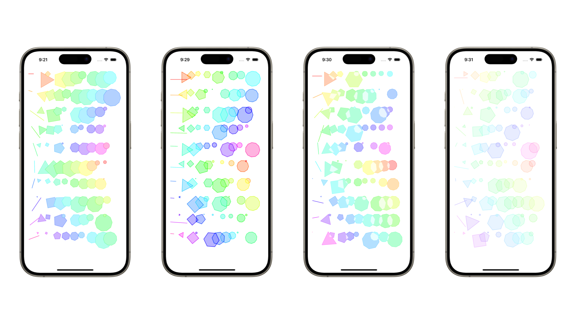 In SwiftUI, these operations are unlocked and applicable to the shapes using the CGAffineTransform methods like rotated(by:) , scaledBy(x:y:) and translatedBy(x:y:) or the related GraphicsContext methods such as rotate(by:) , scaleBy(x:y:) and translateBy(x:y:). This type of operation can be applied to crafting visually complex systems. Layering them together can create unexpected new shapes.