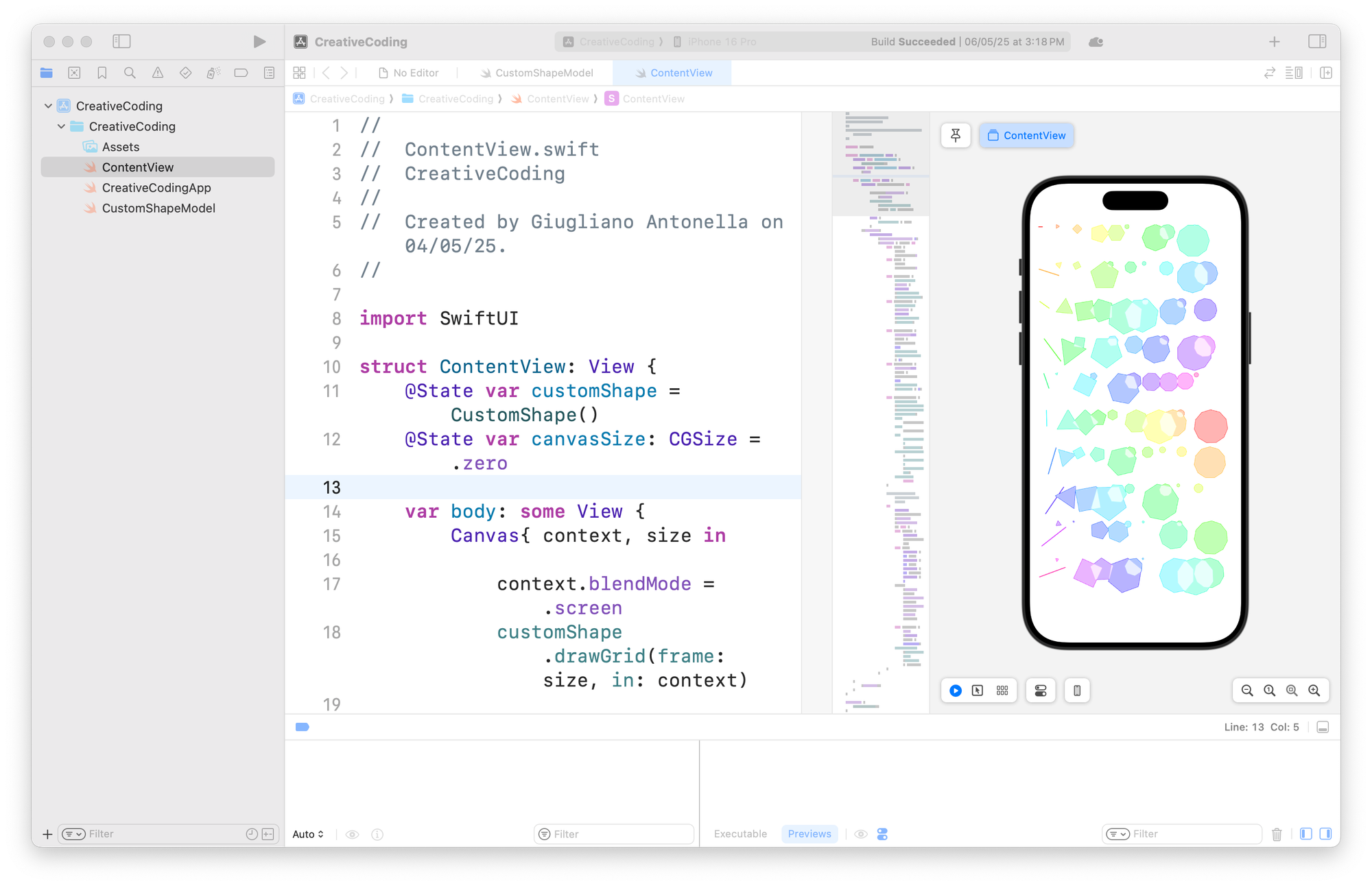 By shifting from a strictly functional mindset to a creative one, Swift and Xcode become complementary instruments that lower the barrier between artists and programming when it comes to computational aesthetics generation: think of the clarity of Swift's expressive syntax, the SwiftUI’s declarative paradigms, the strong type system, and their performance characteristics that create a unique environment that invites artists to think in shapes and gradients, image, texts; Xcode itself and its live previews accelerate a feedback-driven workflow facilitating rapid iteration and allowing artists - coders to see changes instantly as they modify the code; components like Canvas enables drawing and some other such as TimelineView continuous animation, giving our static compositions life through motion by surfacing generative patterns and algorithmic compositions in real time; Metal integration can further extends possibilities into GPU-powered generative art, making the iPad and Mac potent surfaces for interactive installations. And that’s not only that. There’s room to go much more in-depth if starting to think about how interaction can be implemented using frameworks such as Vision to detect any sort of interactivity in real-time and play around with its effect on the co-created visual outputs.