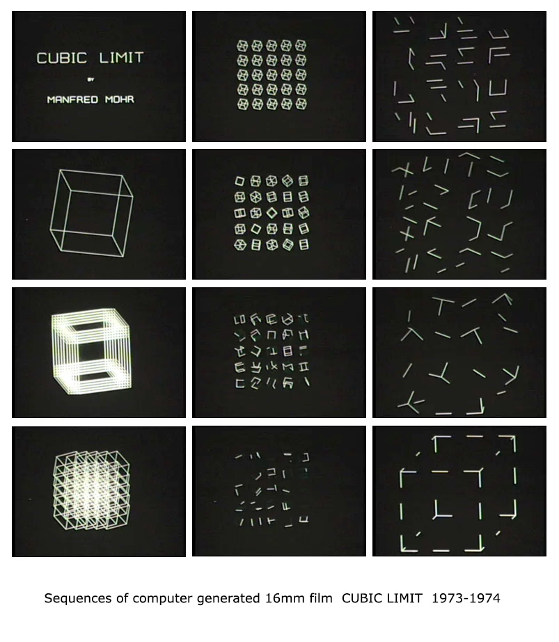 Pioneering computational artist Manfred Mohr was among the first to systematically explore algorithmic transformations of simple geometric structures. His "Cubic Limit" series (1973-1976) deconstructed and transformed the cube through rotations and dimensional projections, creating unexpectedly elegant compositions from rigorous mathematical operations. Similarly, computer art pioneer Vera Molnár's "Transformations" (1976) applied systematic rotational and scaling operations to simple square forms, allowing subtle variations in the transformation parameters to generate rhythmic visual music on the page.