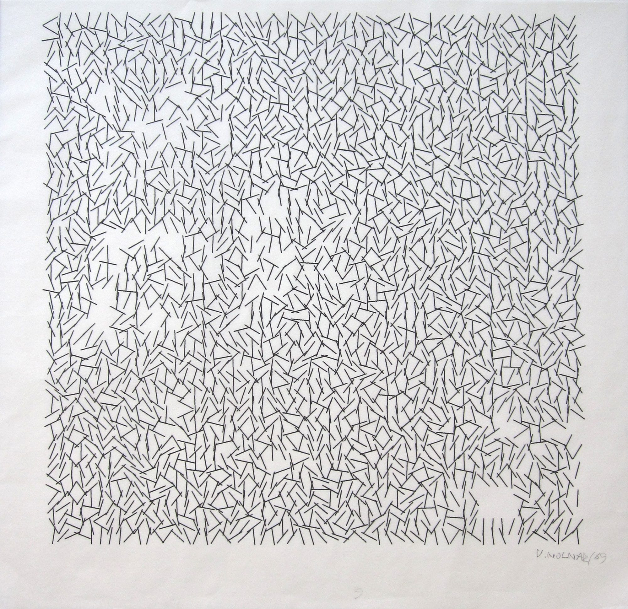 The use of randomness has a rich tradition in computational art where it is widely used as a means to introduce surprise. Again, Vera Molnár was a pioneer in this domain. In pieces like "Interruptions" (2015), she combines ordered systems with controlled interruptions, creating visual compositions that feel balanced between determinism and chance—a balancing act that lies at the heart of effective generative art.