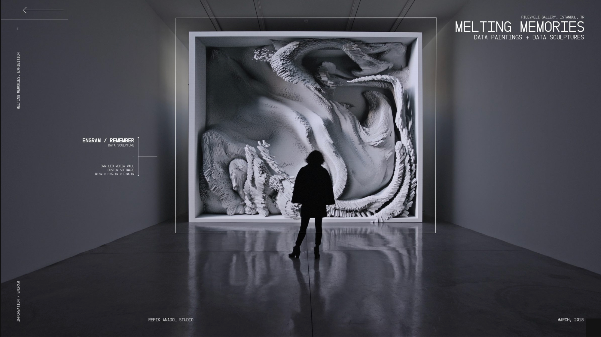 Refik Anadol's data sculptures like "Melting Memories" use EEG data collected from subjects recalling childhood memories to drive complex visual simulations, creating flowing, dynamic projections that visualize the invisible processes of memory formation.