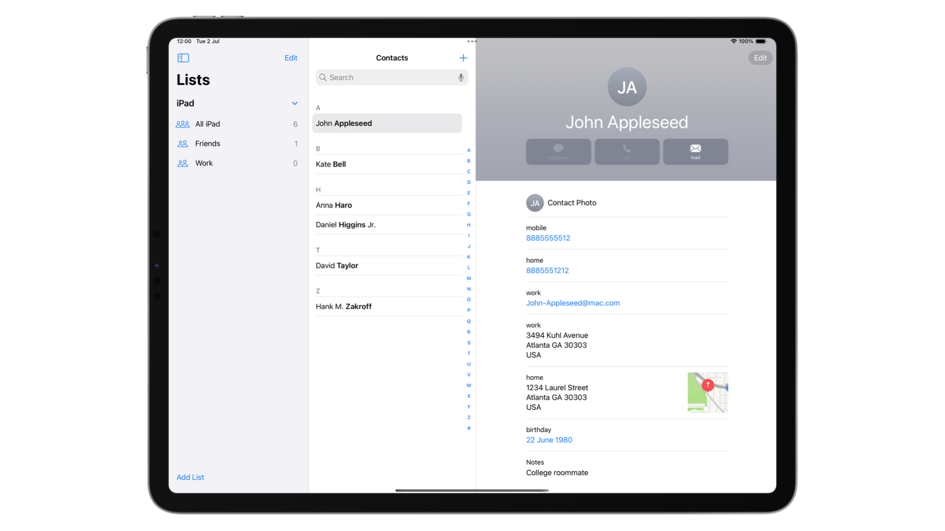 On iPadOS, the NavigationSplitView makes full use of the larger screen by occupying the entire display. Users can hide the sidebar by pressing the Sidebar button and bring it back by swiping from left to right for a quick view, or by pressing the button again to keep it fixed. This behavior remains consistent in both portrait and landscape modes.