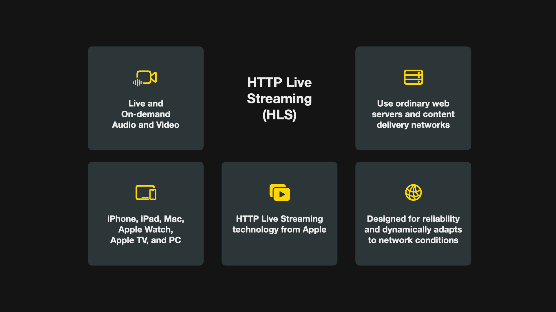 Apple provides extensive resources about HLS and promotes the technology for live and on-demand audio and video to iPhone, iPad, Mac, AppleTV, and even Apple Watch as well as PC. HLS is advertised as being designed for reliability and being able to dynamically adapt to network conditions by optimizing playback.