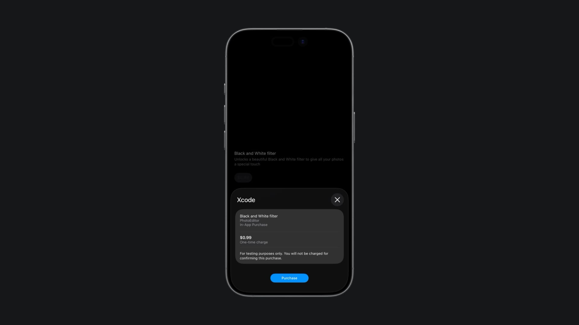 Now you can run the app on your device to test the In-App Purchase. When you tap the buy button, a payment sheet will appear, informing you that you won't be charged and that this is for testing purposes only.