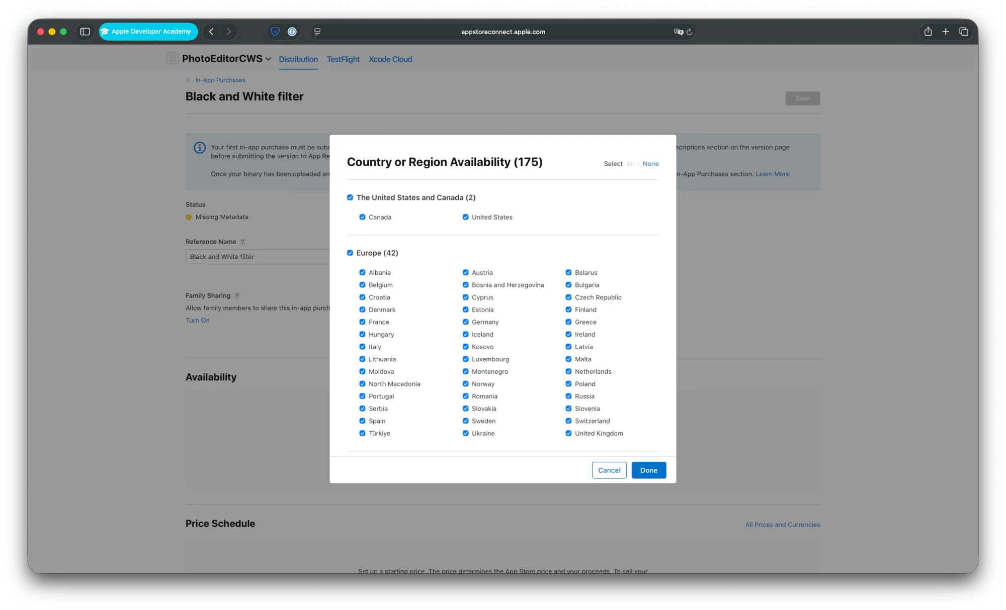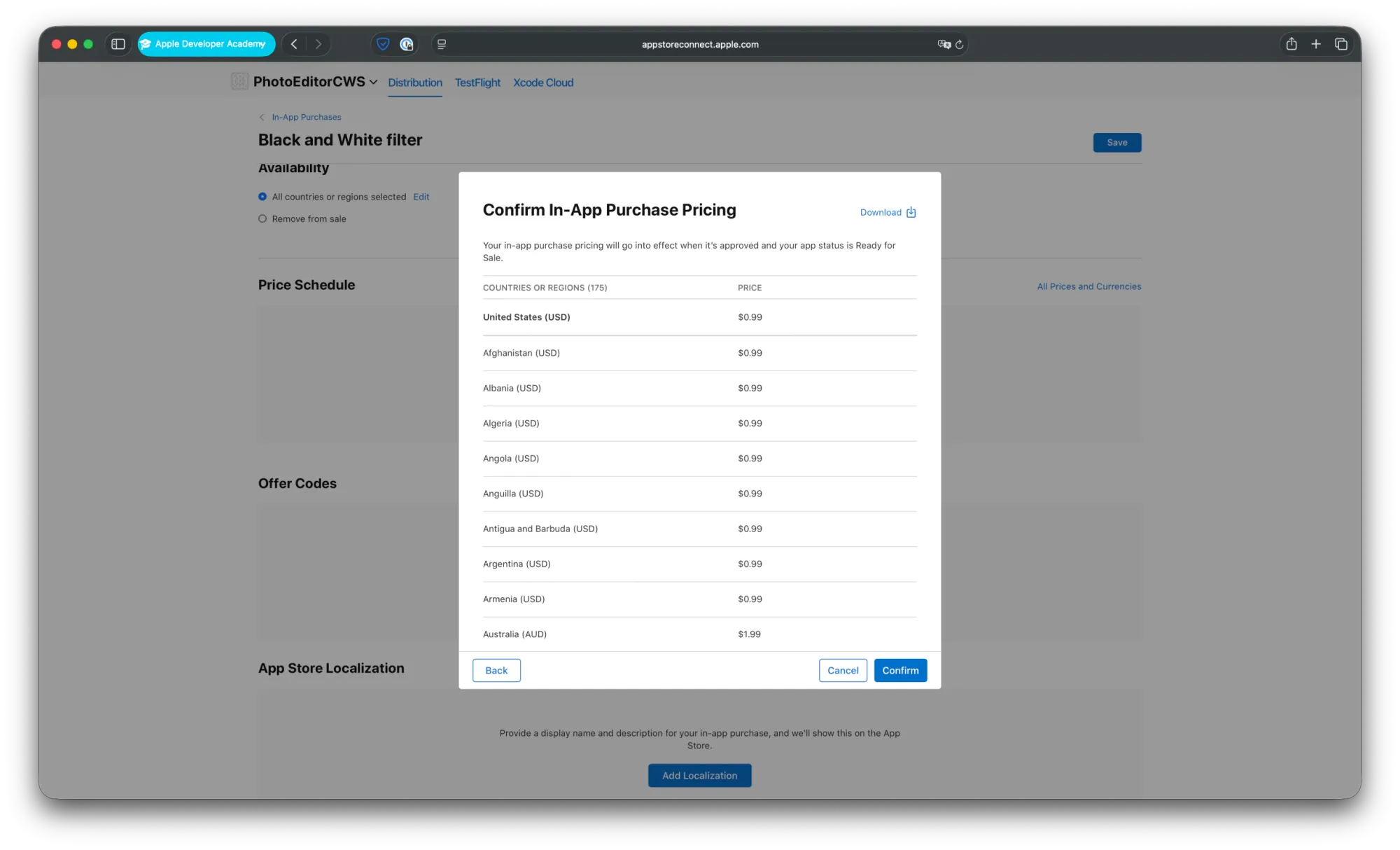 In the “Availability” section, choose the countries where your In-App Purchase should be available. You can just keep the preselection for all available countries here.