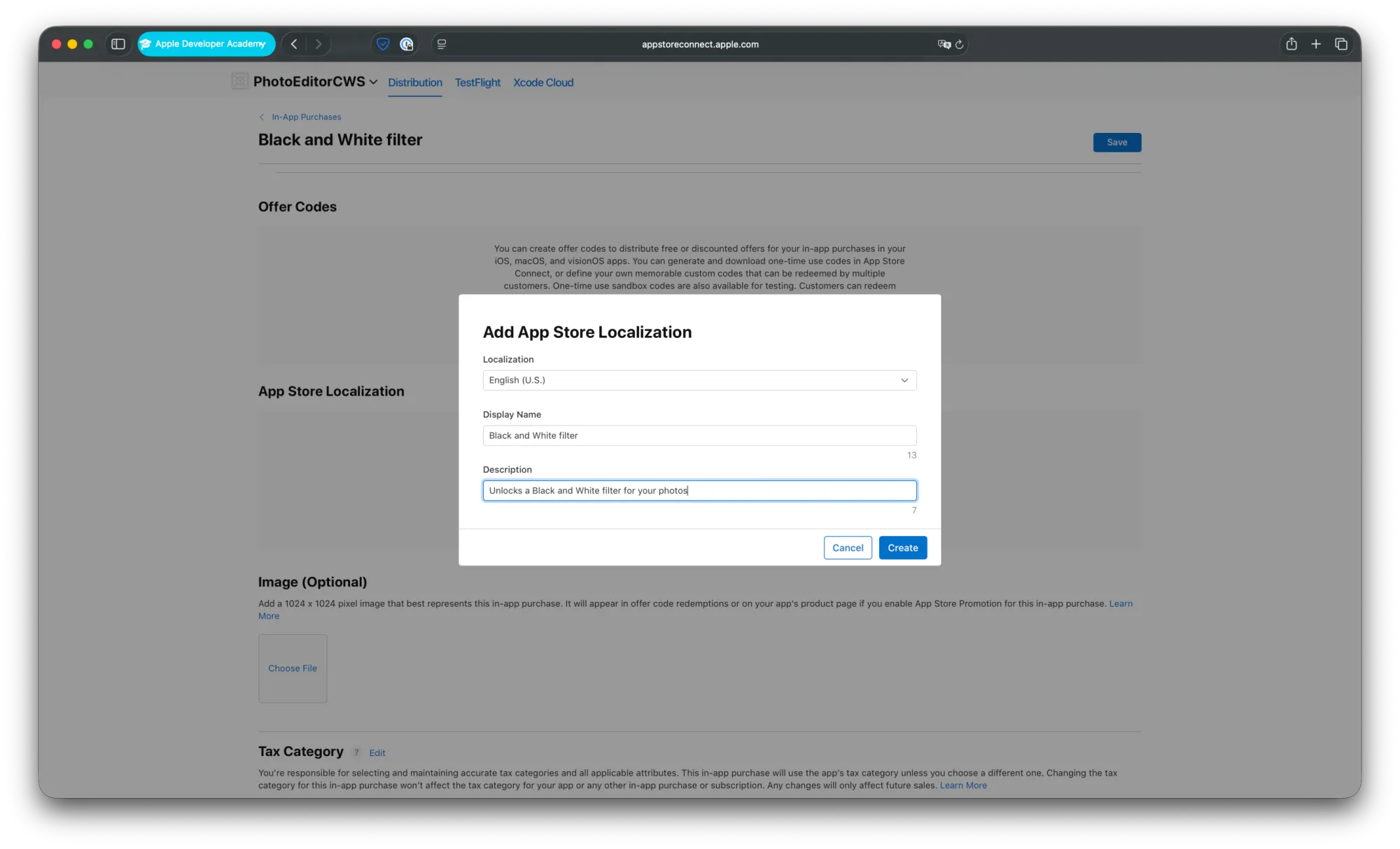 Now you have successfully created your first In-App Purchase. The last thing you need to do to be able to show this as an option to a user in your app, is setting a "Display Name" and "Description". I choose “Black and White filter” as the Display Name and “Unlocks a beautiful Black and White filter to give all your photos a special touch”