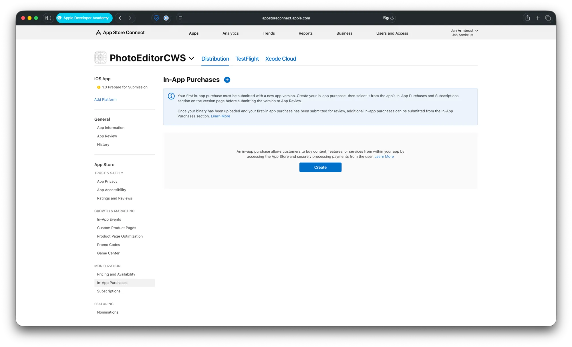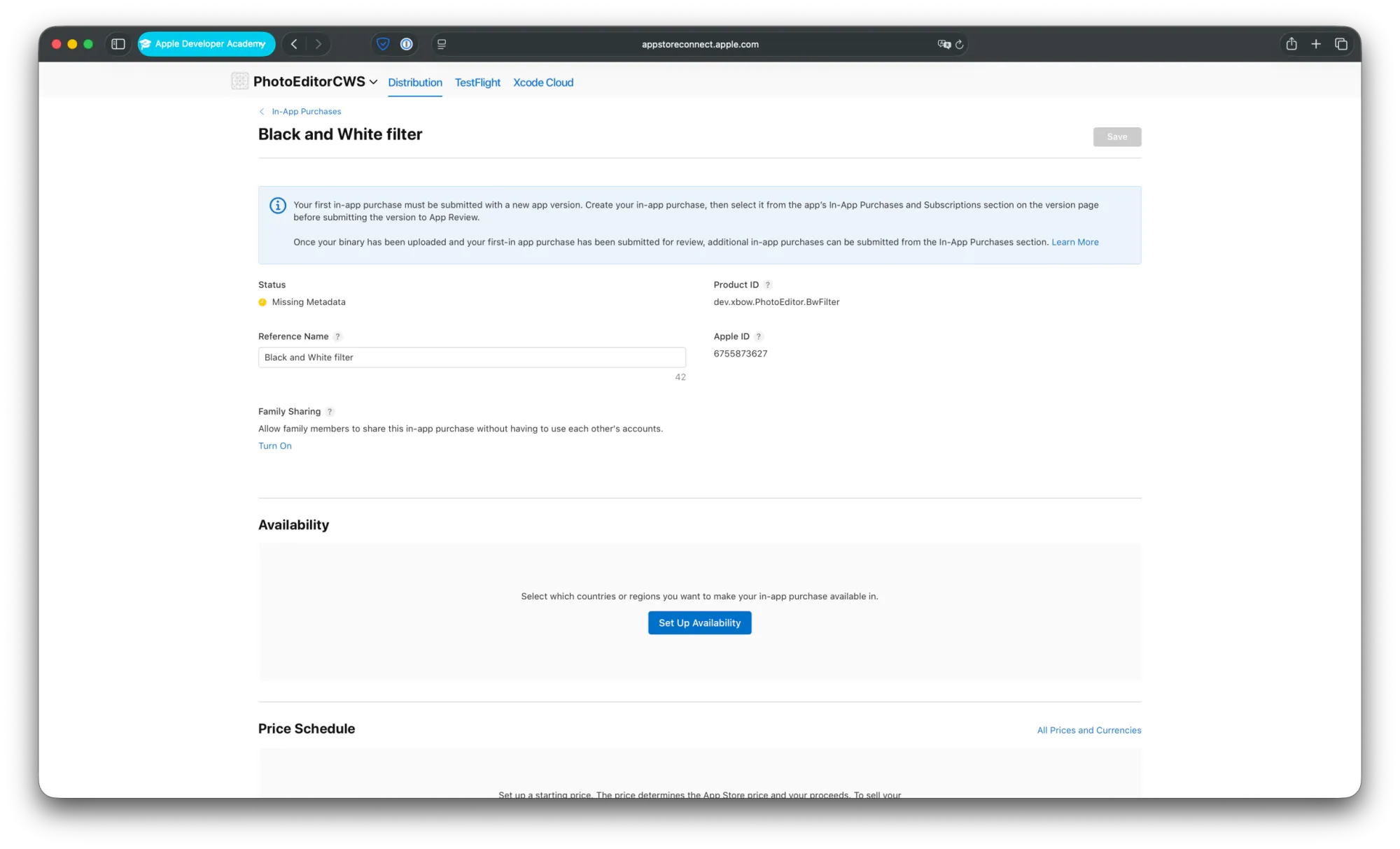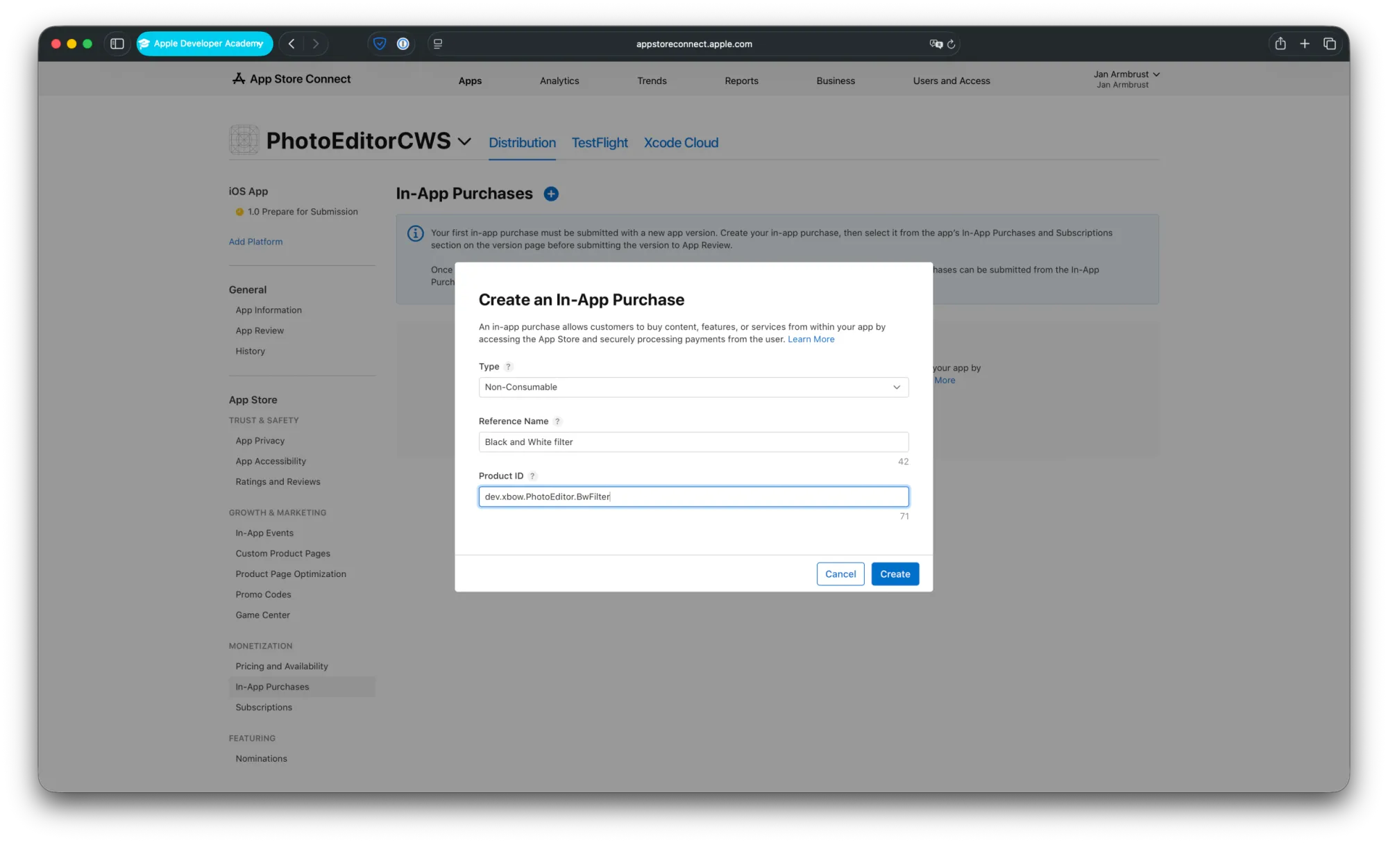 Here you create the same In-App Purchase as in the local StoreKit configuration file earlier.