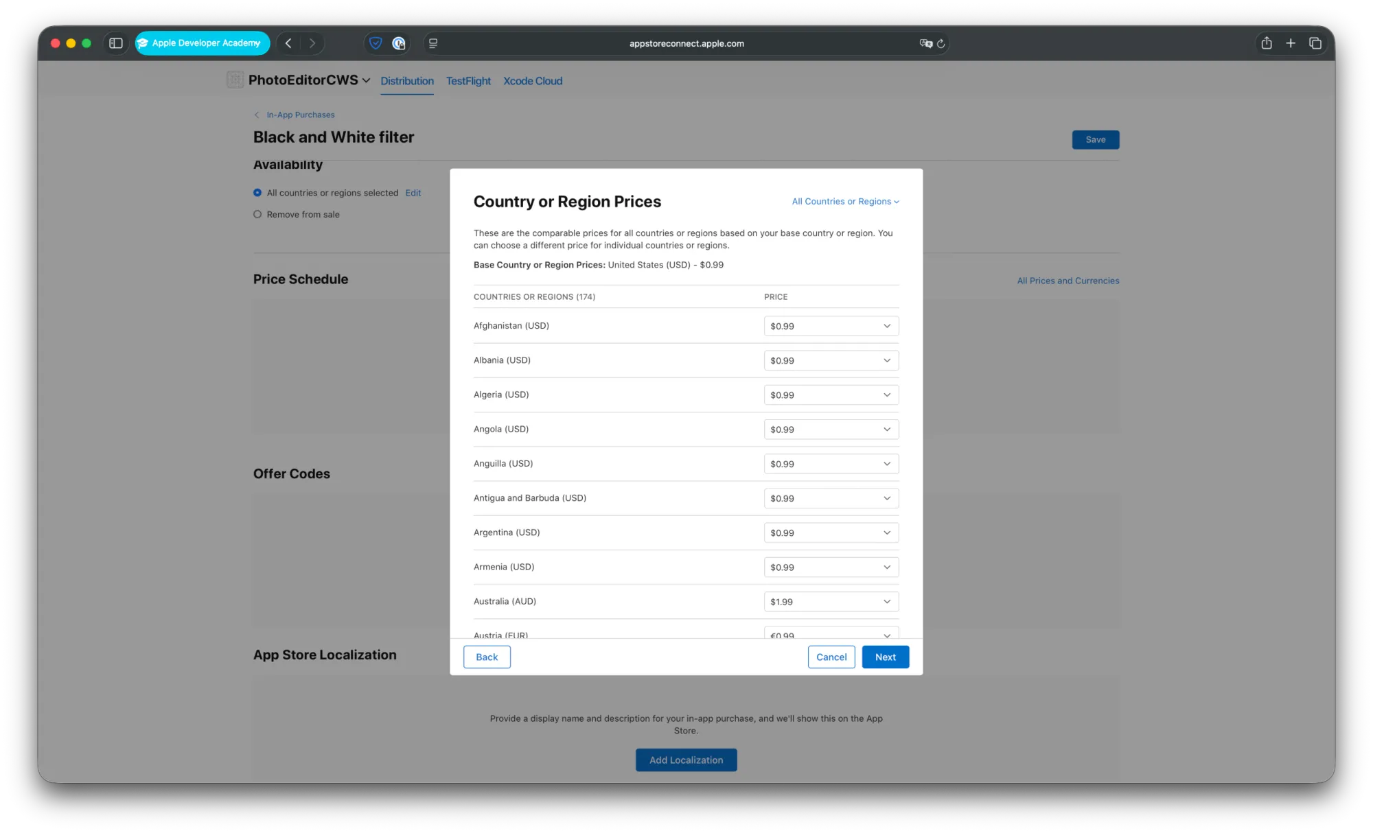 In the second step you could change regional prices for all your selected countries to differ from the base USD price, for example if you want to adjust your prices based on the purchase power of different countries to have a more fair pricing. We’ll keep the preselected regional prices here.
