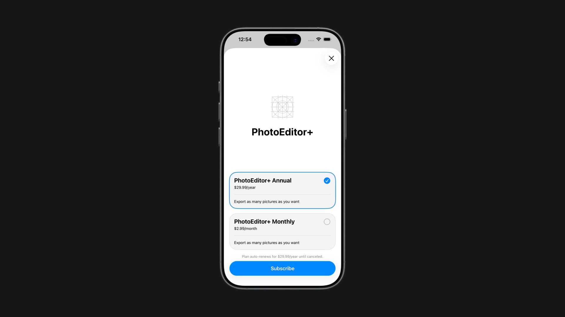 Now you can run the app on your device to test the subscription. When you tap the button titled “Subscribe to PhotoEditor+”, the subscription store sheet will come up, showing the available subscription options.