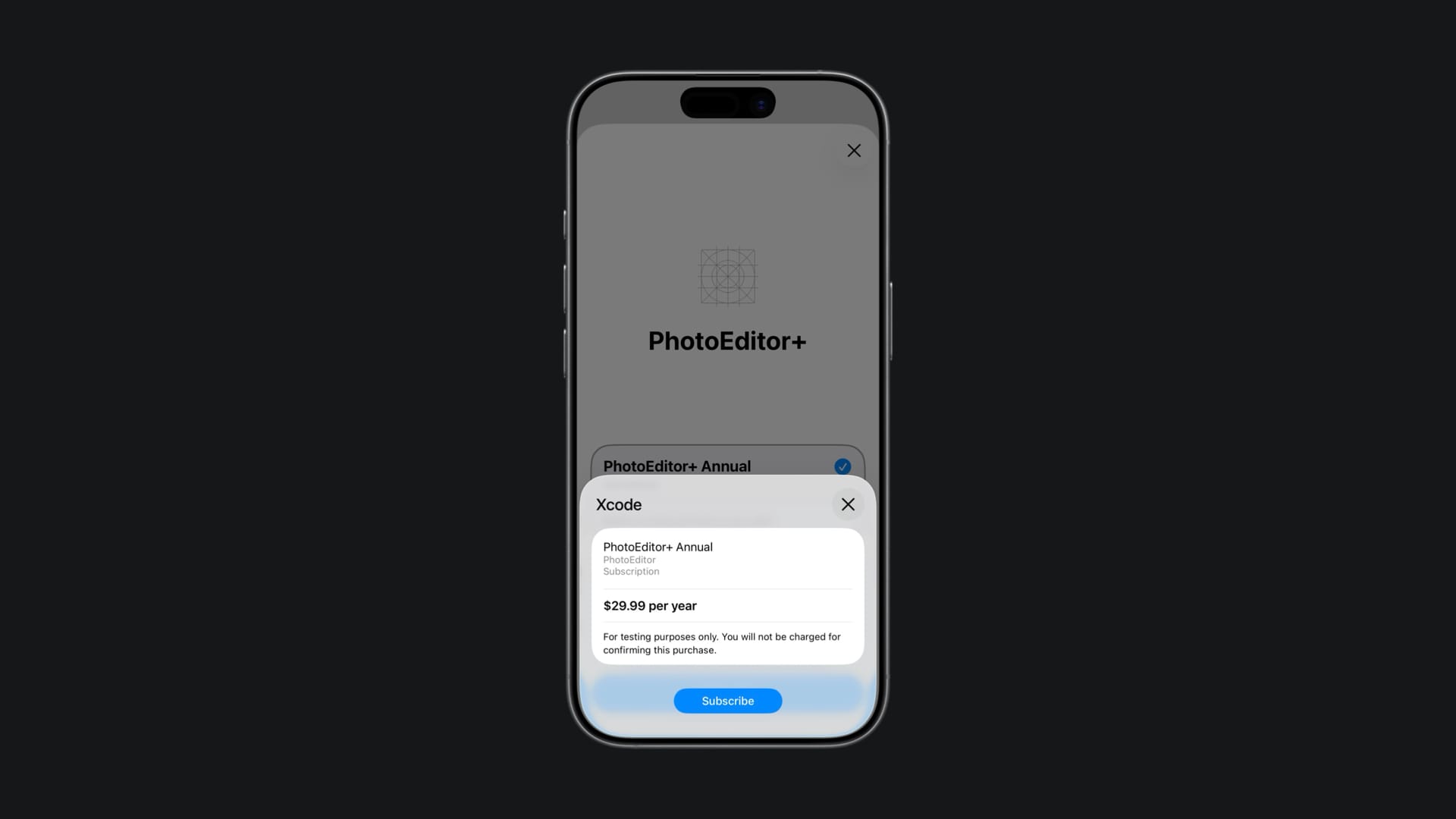 If you select one of the subscriptions and tap the subscribe button, a native payment sheet will come up, informing you that you won’t be charged and that this is for testing purposes only.