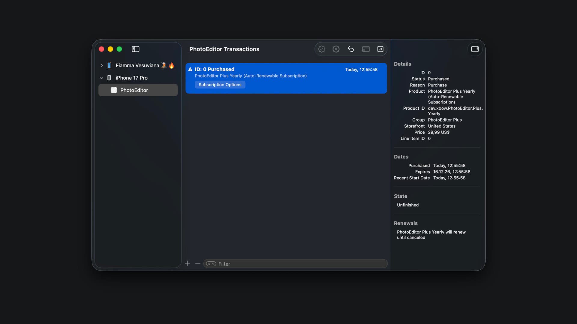 This opens a new window where you can see your device and the “PhotoEditor” app on the right hand side. When you tap on it, all subscription transactions will be shown in the center section. If you select one of the subscriptions, you can see more details on the left hand side.