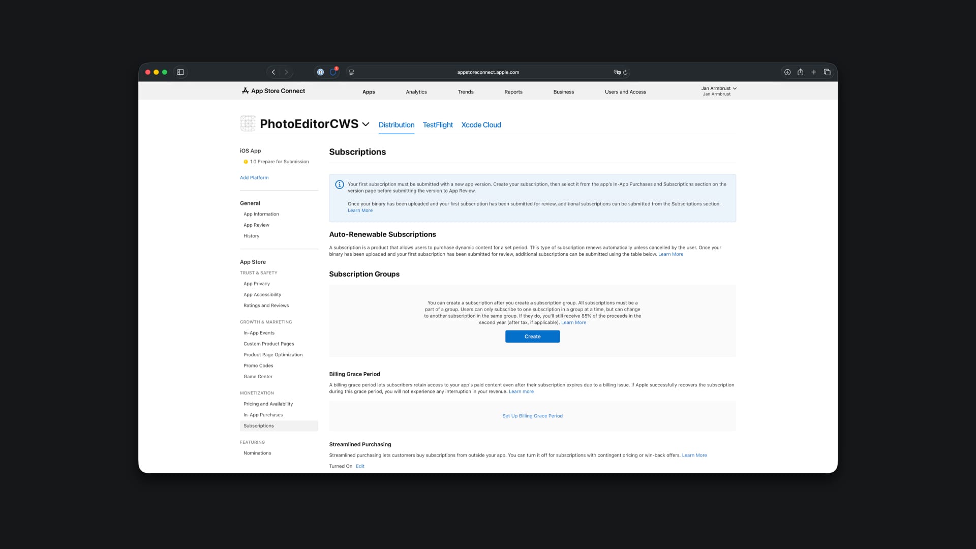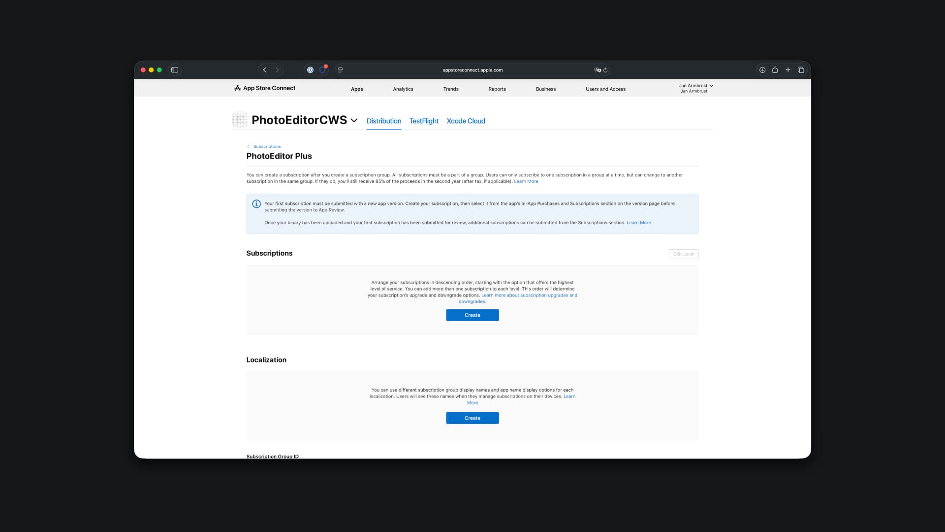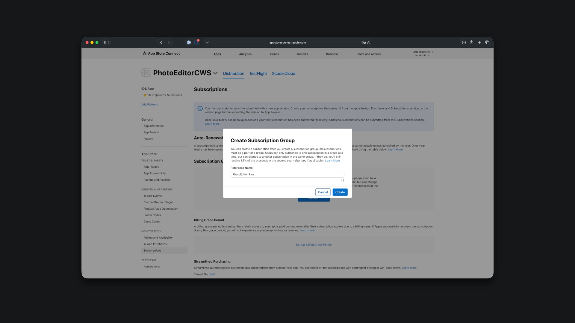 Here you first need to create a subscription group. Tap the “Create” button under “Subscription Groups” and give the group the same reference name you used in the local StoreKit configuration file, for example “PhotoEditor Plus”.
