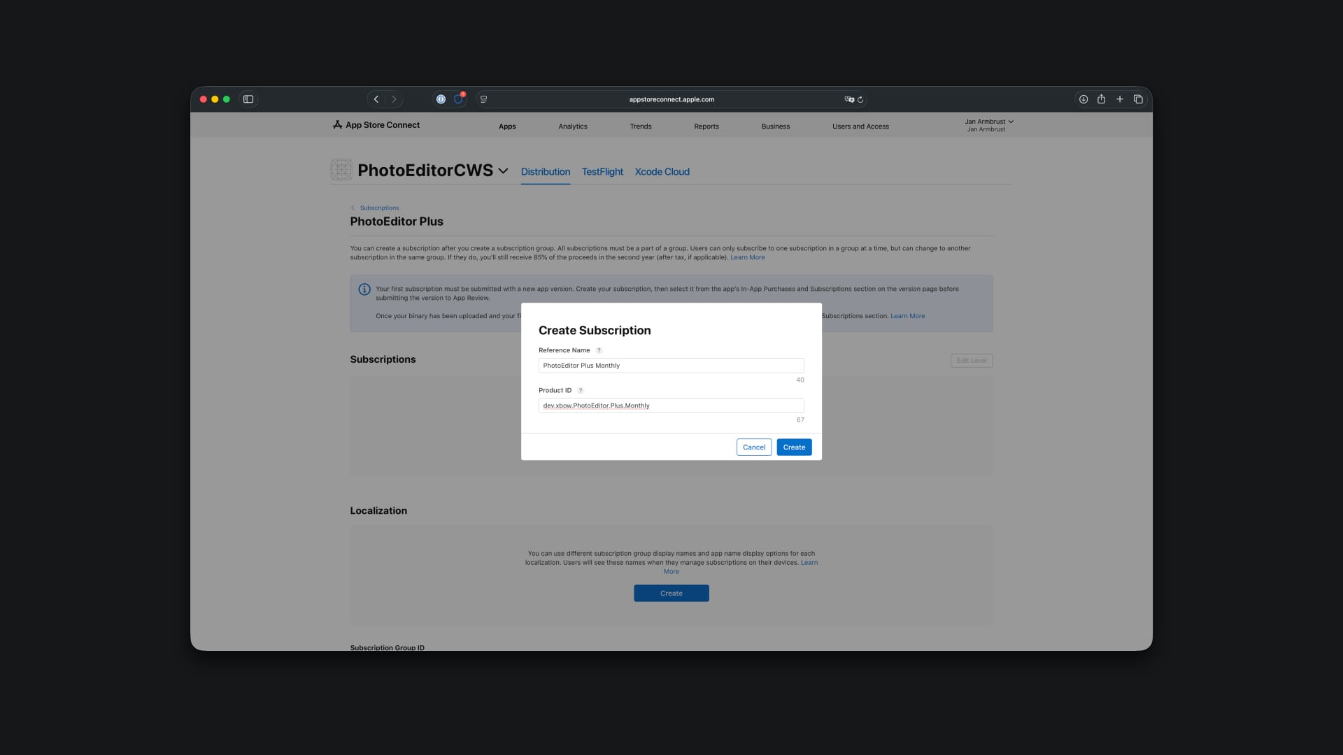Now create your first subscription inside the group. Tap “Create” and choose a reference name such as “PhotoEditor Plus Monthly”. For the Product ID, use the same identifier you used locally by taking your app’s bundle identifier and appending another component, for example .Plus.Monthly.