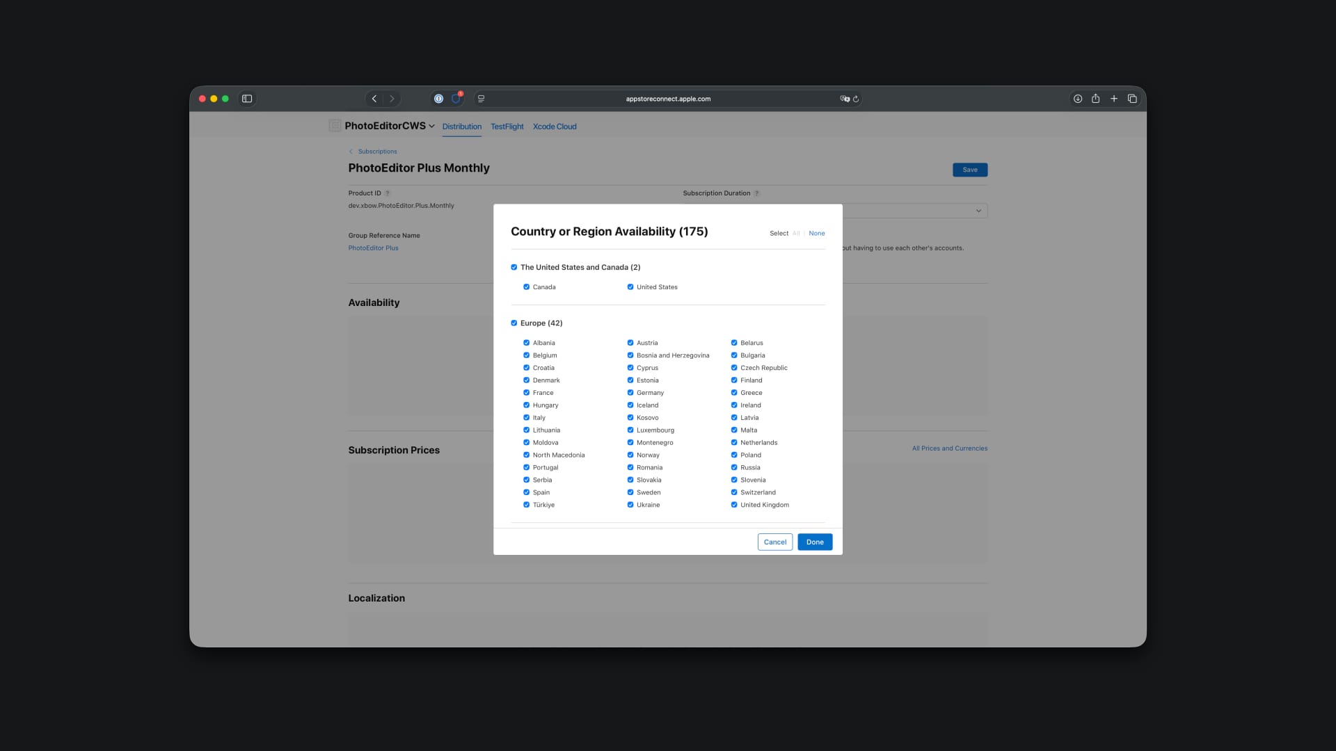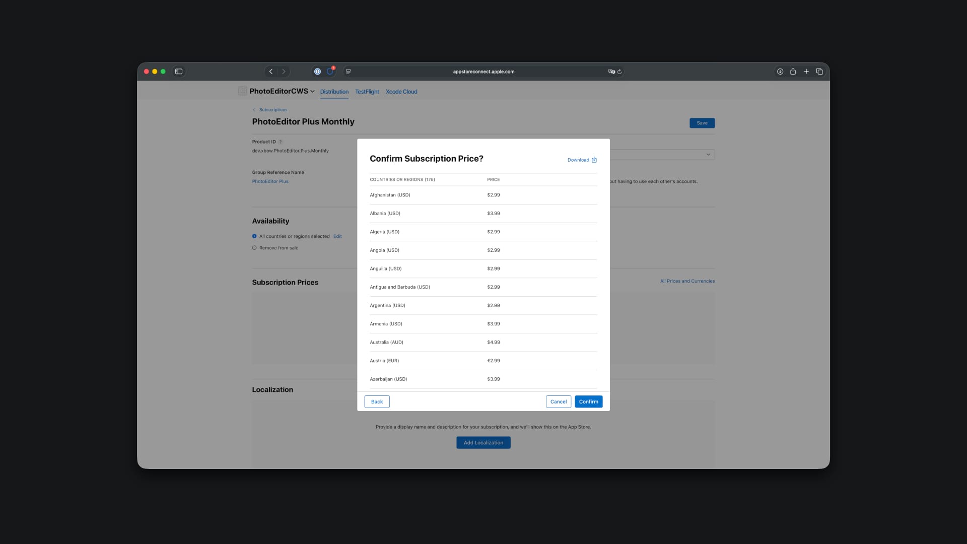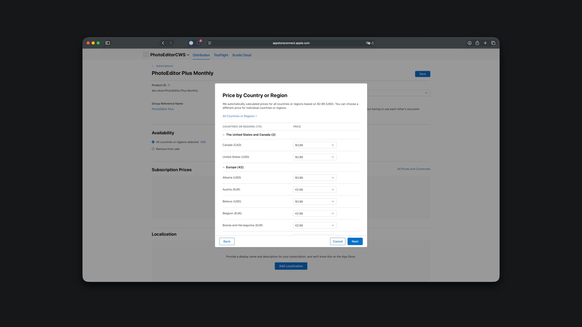 In the “Availability” section, choose the countries or regions where your subscription should be available. You can keep the default selection to make it available in all countries and regions.