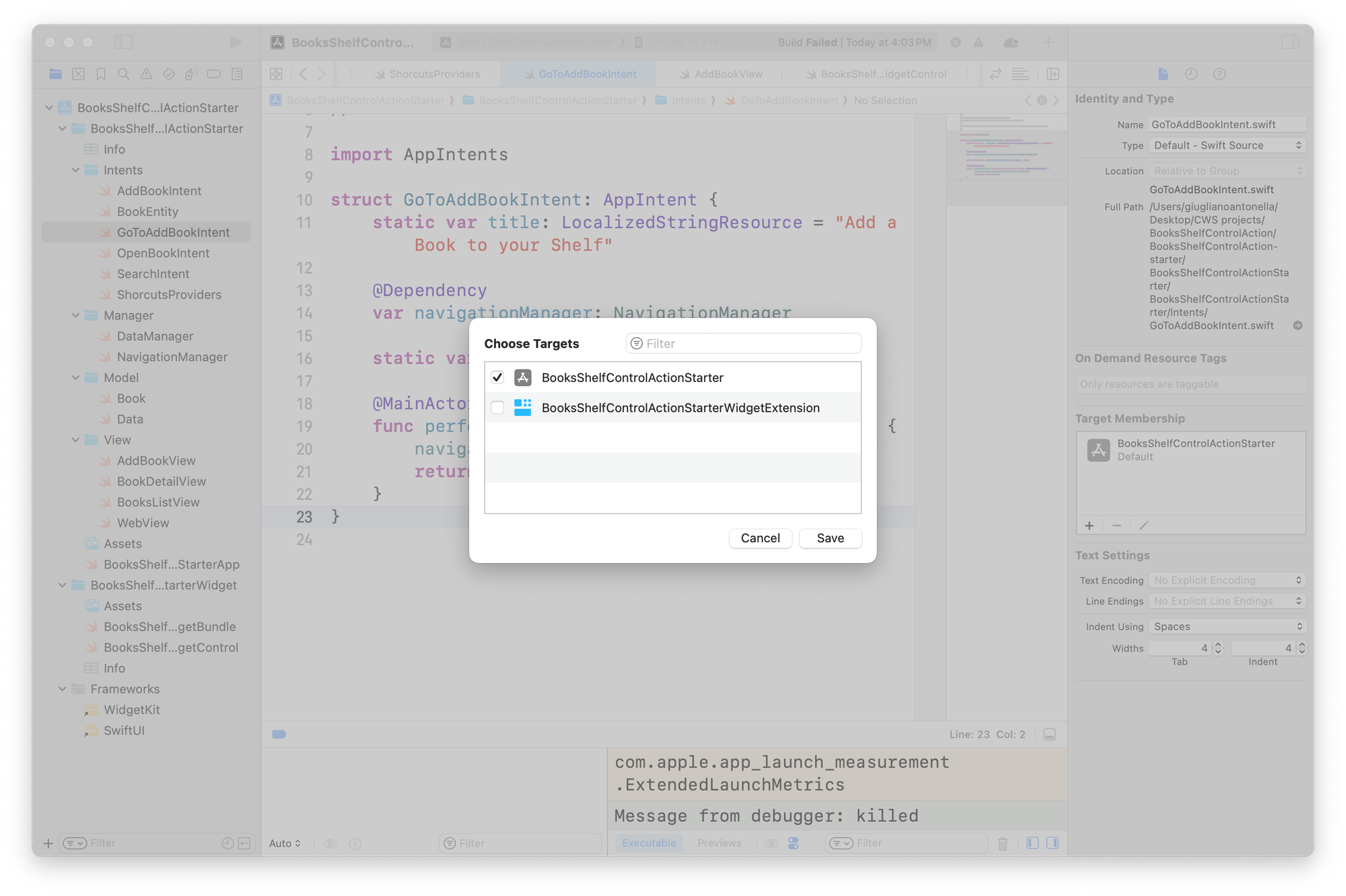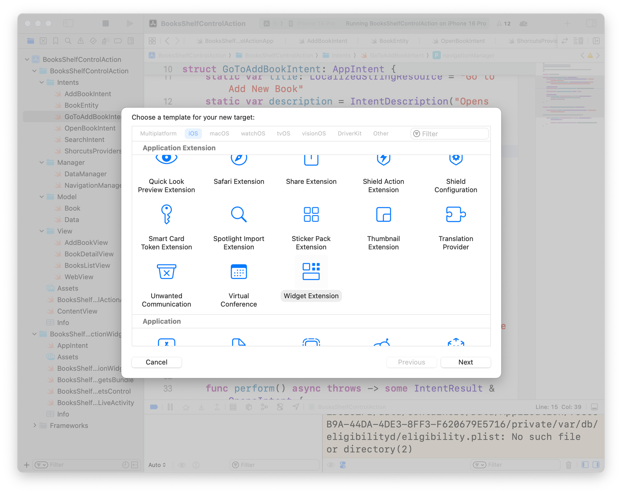 If you try to launch the app, you will receive a series of errors as the files are not shared to the widget target. Repeat this process until all the files involved with the intent have the widget extension target included. At the point, you will be able to correctly build the app.