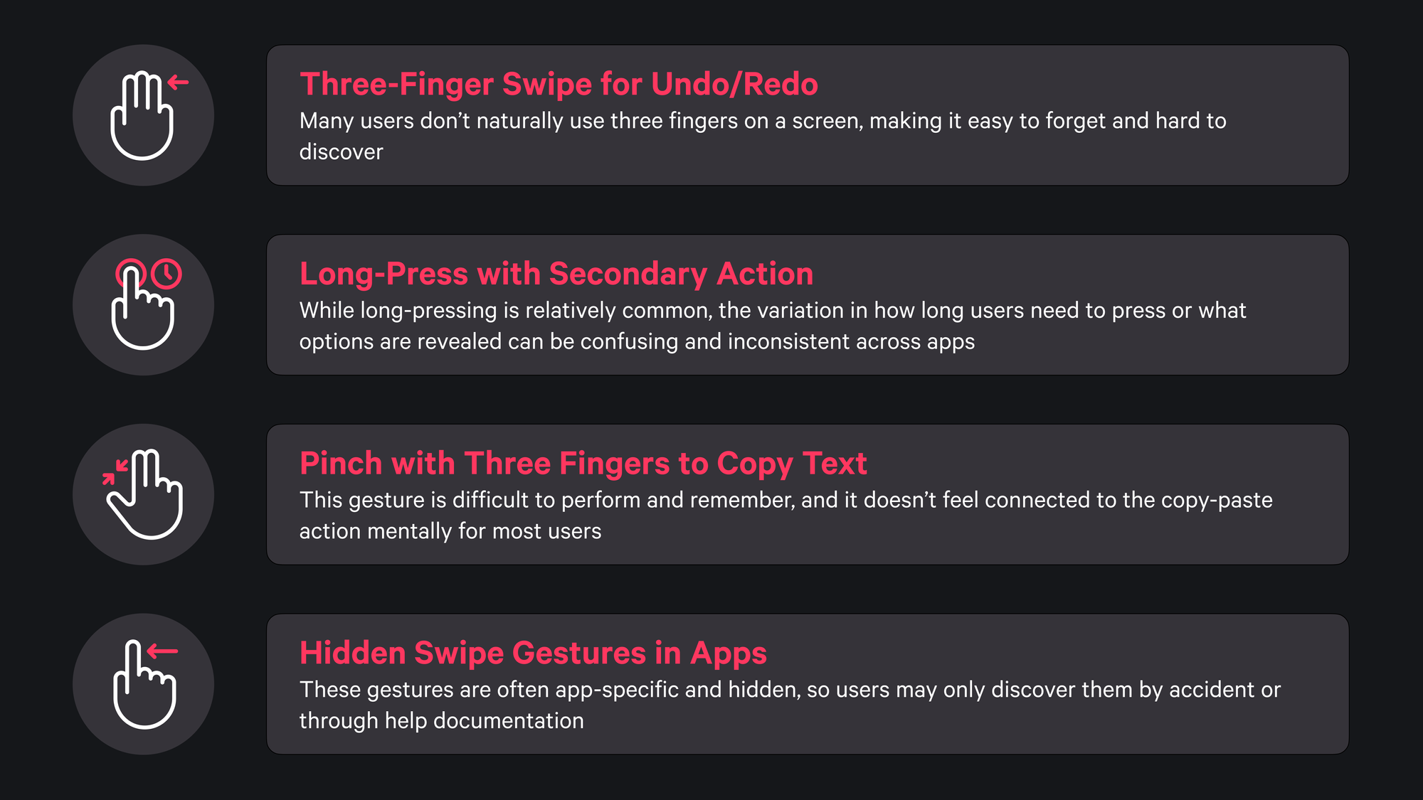 Some gestures, while functional, are less intuitive and often harder for users to remember or discover on their own. For example, swiping with three fingers to undo or redo an action may be beneficial in some contexts, but the three-finger swipe is not a natural movement for most users. Similarly, a long-press action on an icon can reveal secondary options, but users often don’t know how long to press, and the variations in actions across different apps can create inconsistency and confusion.
