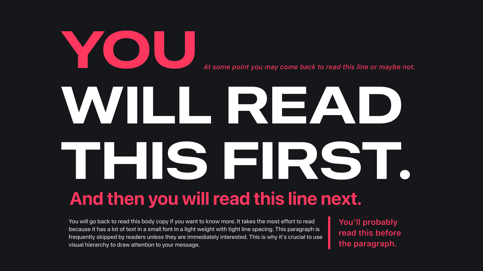 In Ensure Visual Accessibility: Using Typography we discussed how, through the use of appropriate fonts, sizes, and styles, we can create a visual hierarchy that guides the user's eyes from one level of importance to another.