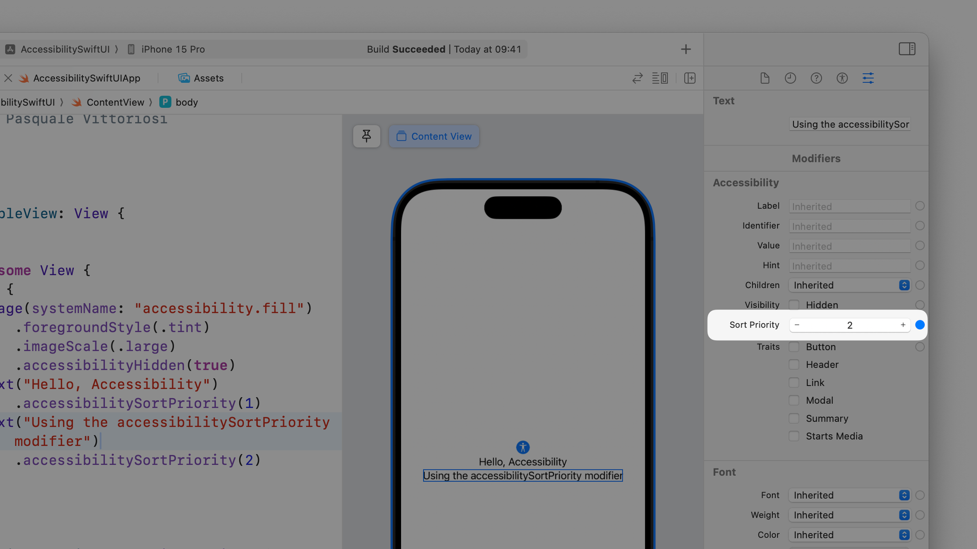 Text("Using the accessibilitySortPriority modifier")