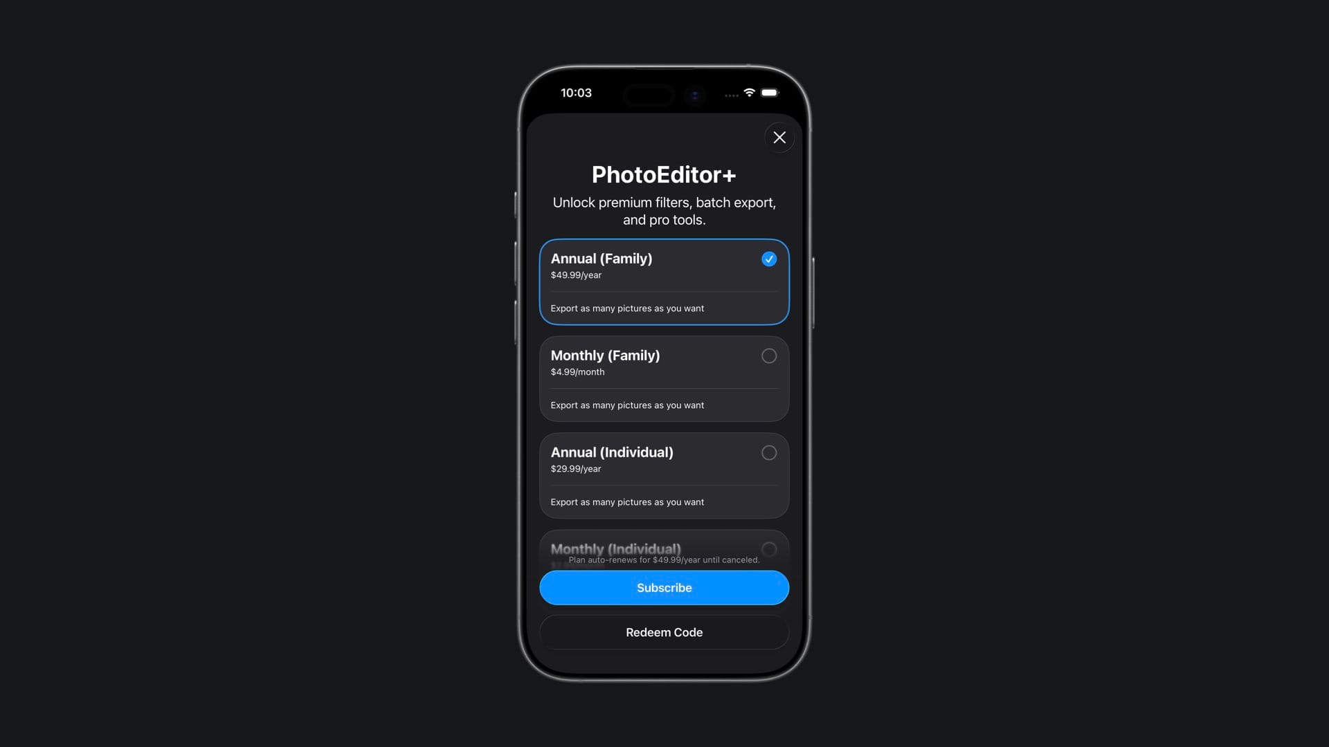 SubscriptionStoreViewshows all subscription options in the group.- Shows the system button to redeem Promo Codes.