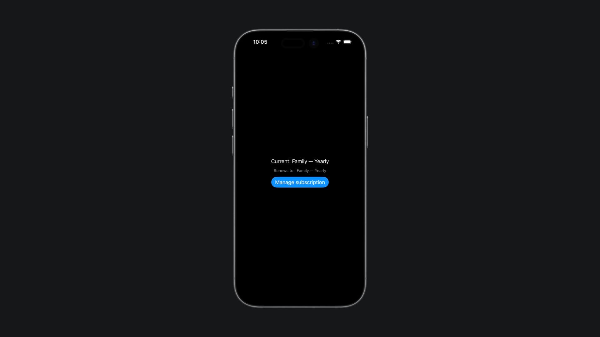 Run the app on a device and open the store sheet. You’ll see the subscription options for Individual and Family plans. Select a plan and complete a purchase to activate it.