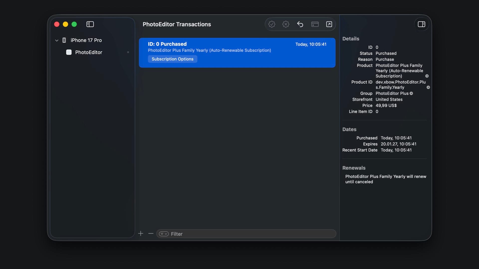 Tap on PhotoEditor in the top bar and select “Edit Scheme”. Under “Options”, select your PhotoEditor.storekit file as the StoreKit configuration. Once selected, the subscription store should show the four subscription options with their names, descriptions, and prices.