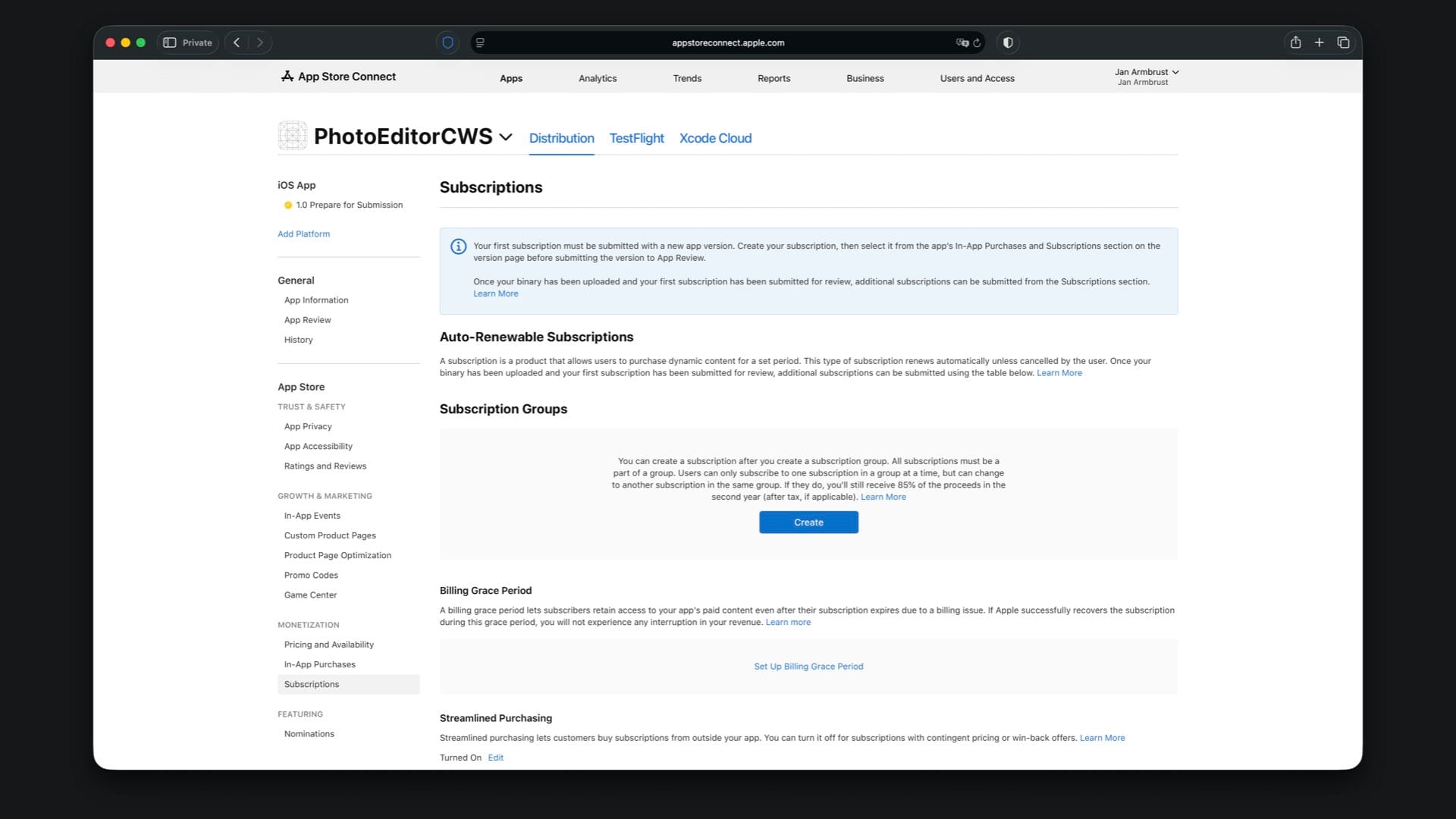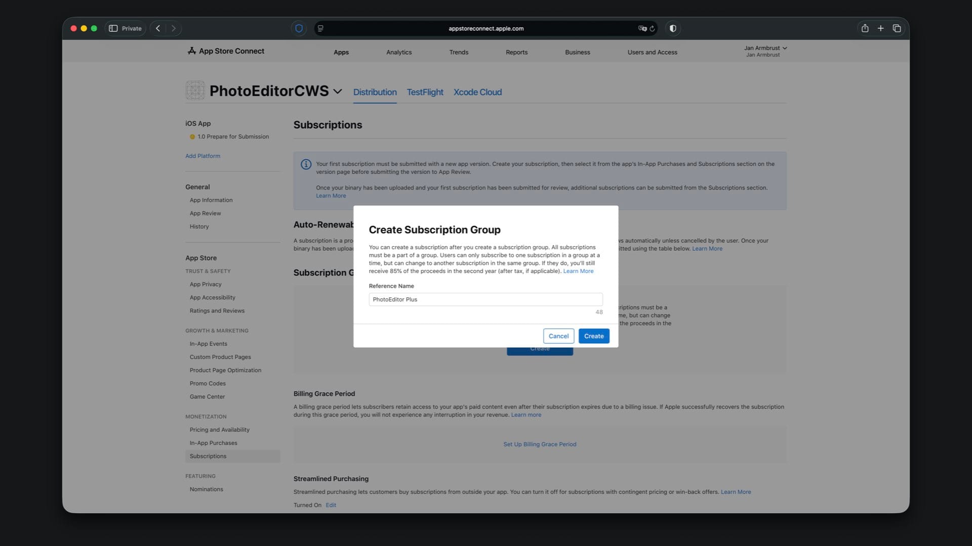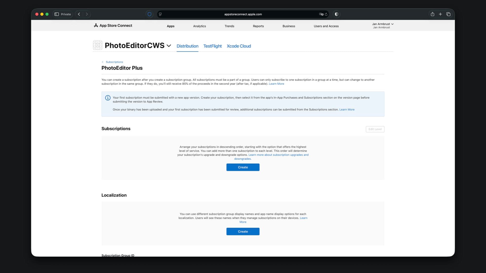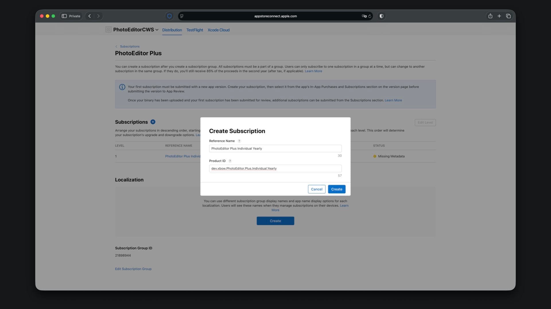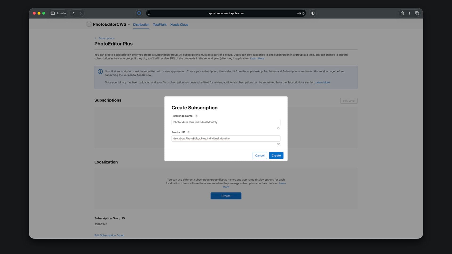 Here you first need to create a subscription group. Tap the “Create” button under “Subscription Groups” and give the group the same reference name you used in the local StoreKit configuration file, which is “PhotoEditor Plus”.