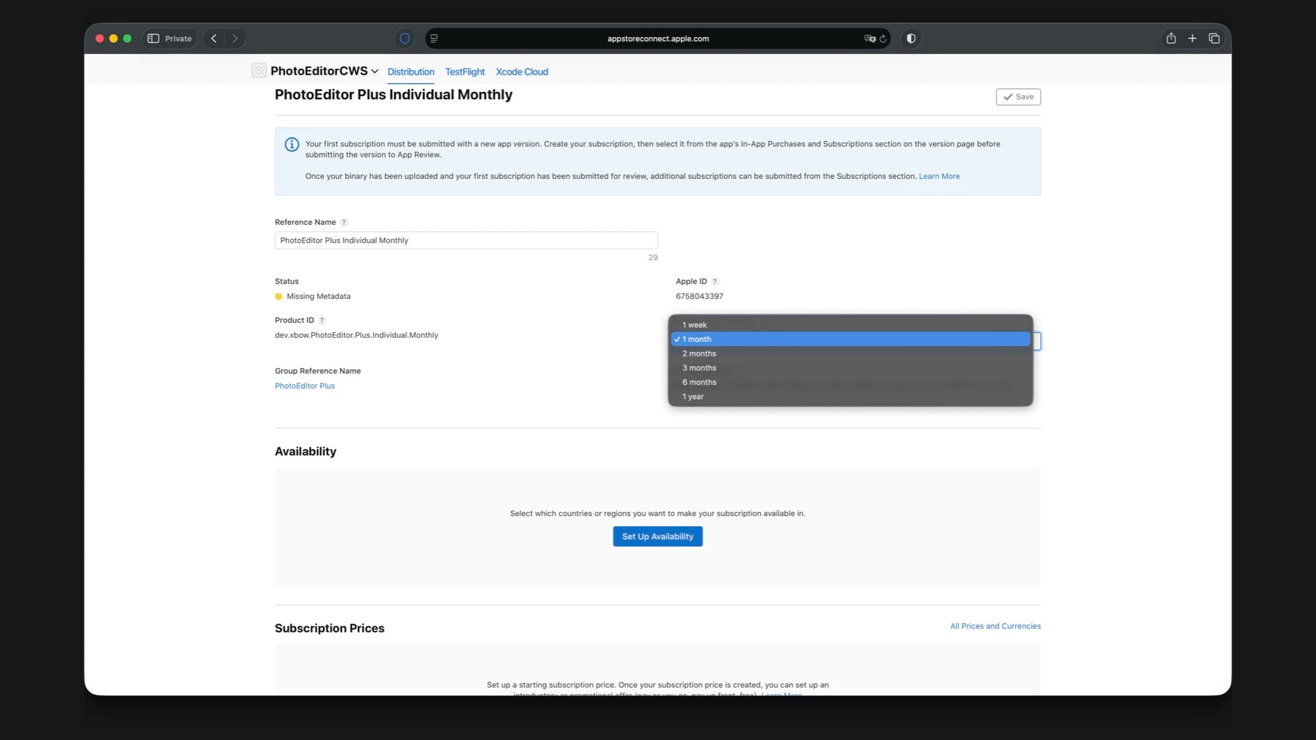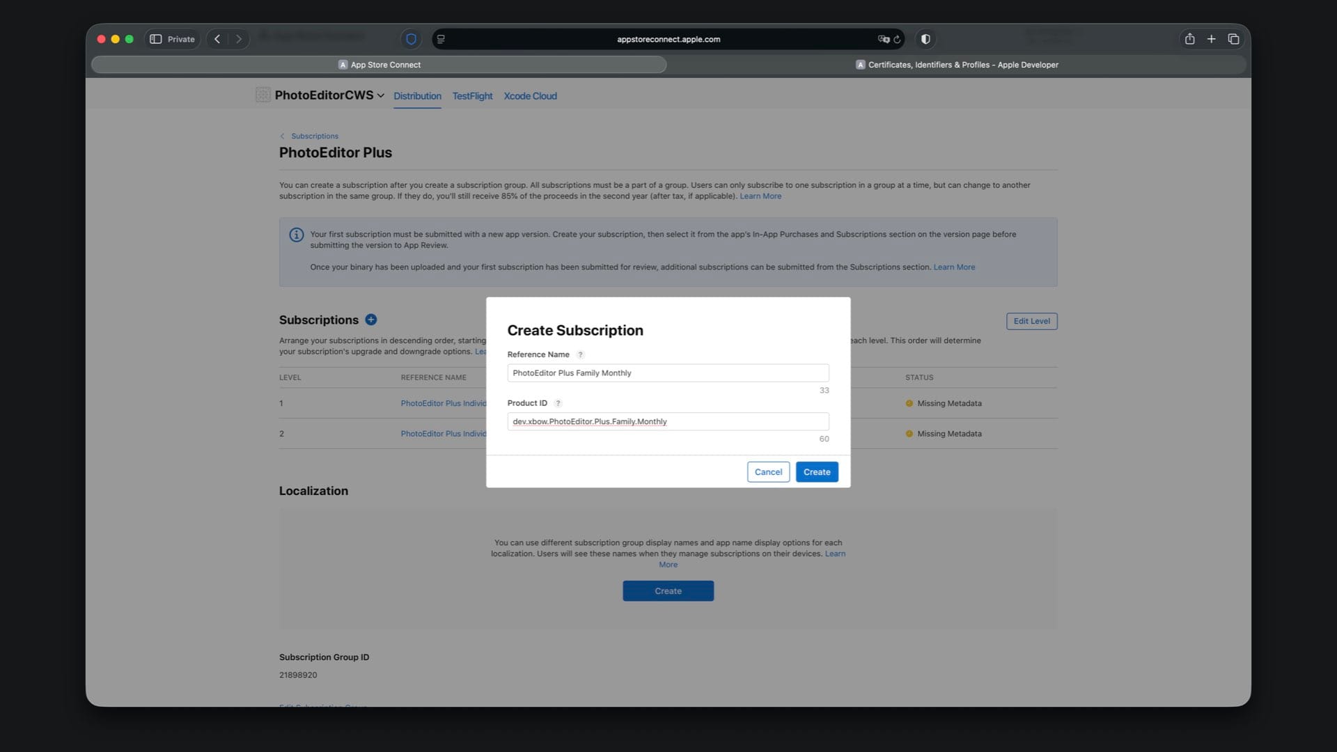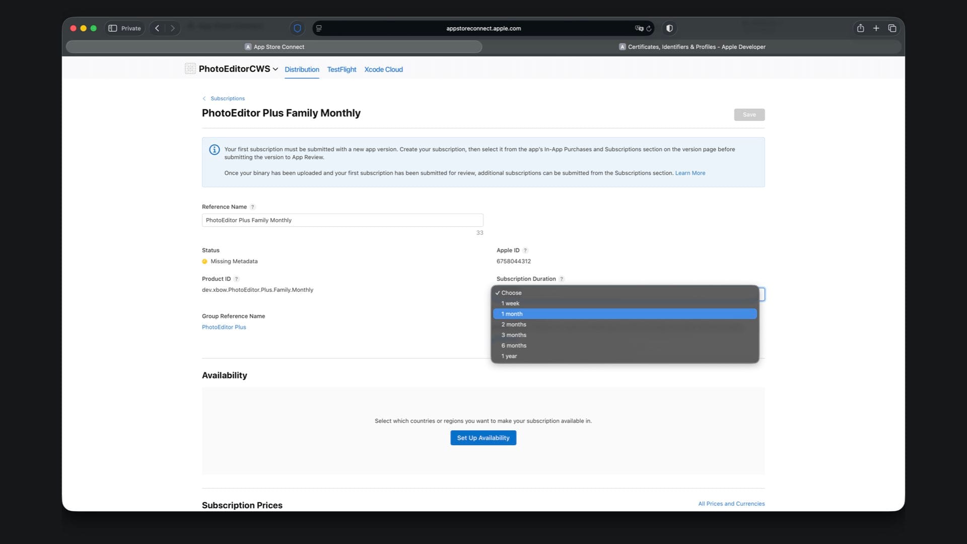 Create “PhotoEditor Plus Family Monthly” with Product ID suffix .Plus.Family.Monthly and select a one month duration.