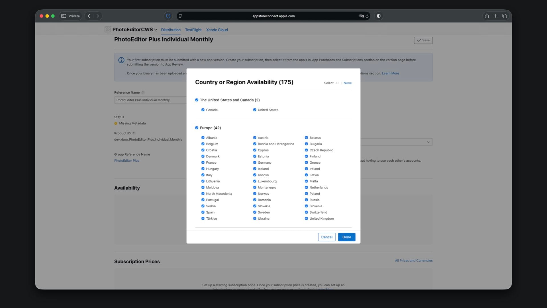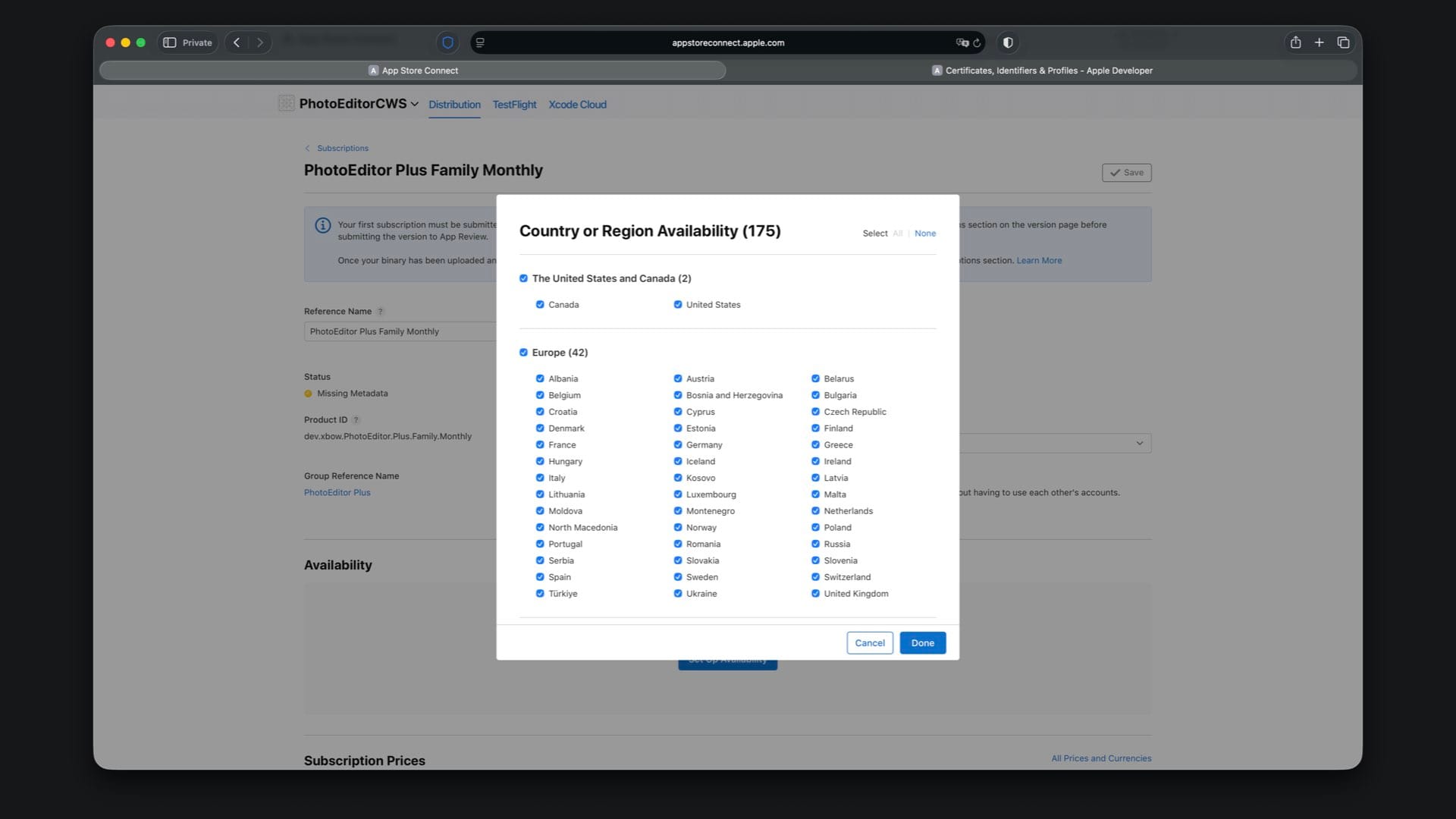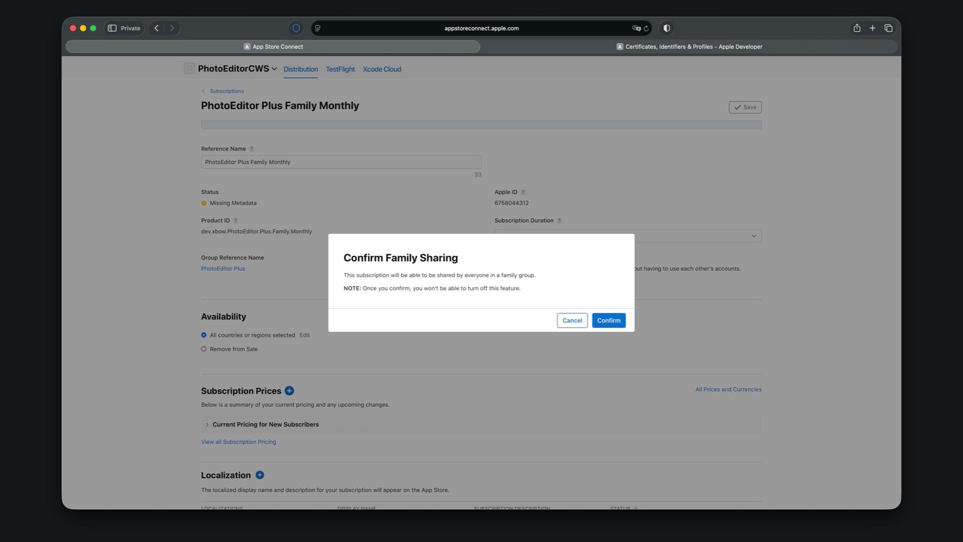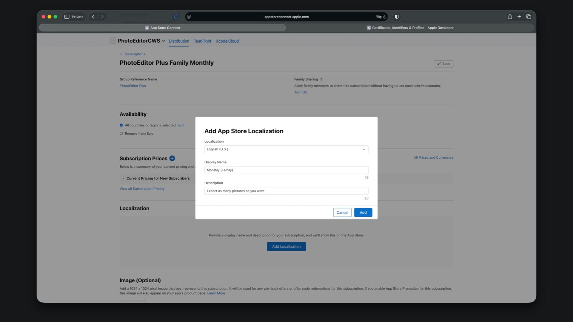 Create “PhotoEditor Plus Family Monthly” with Product ID suffix .Plus.Family.Monthly and select a one month duration.