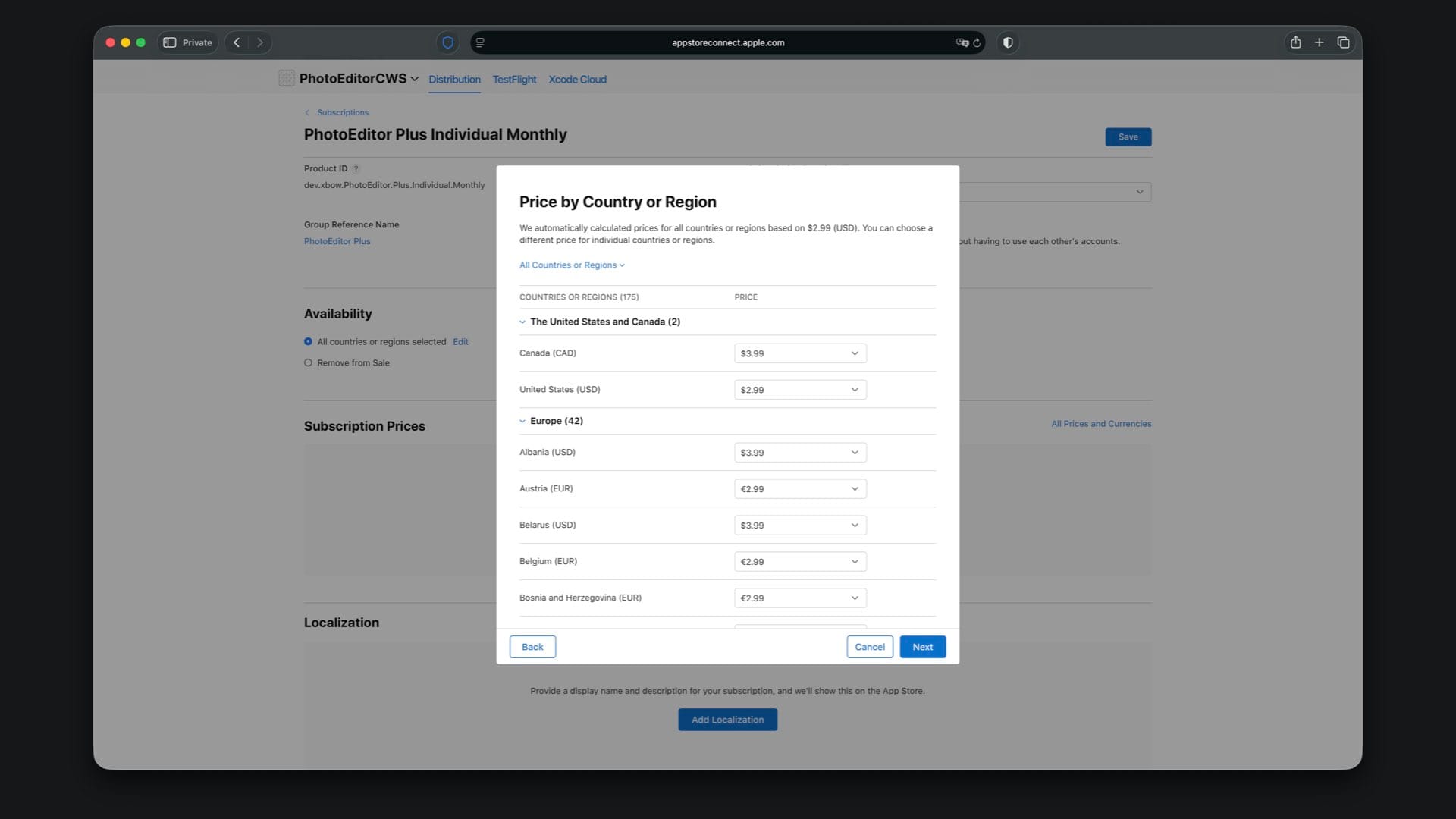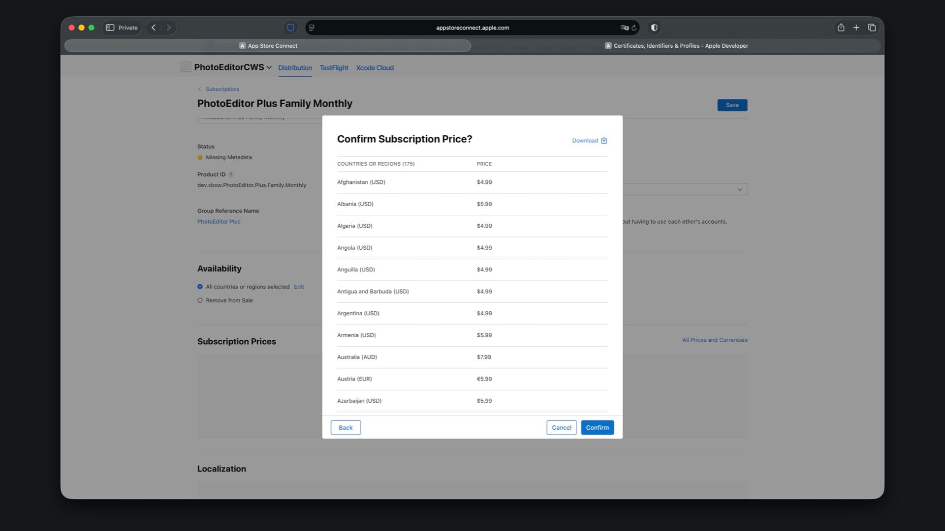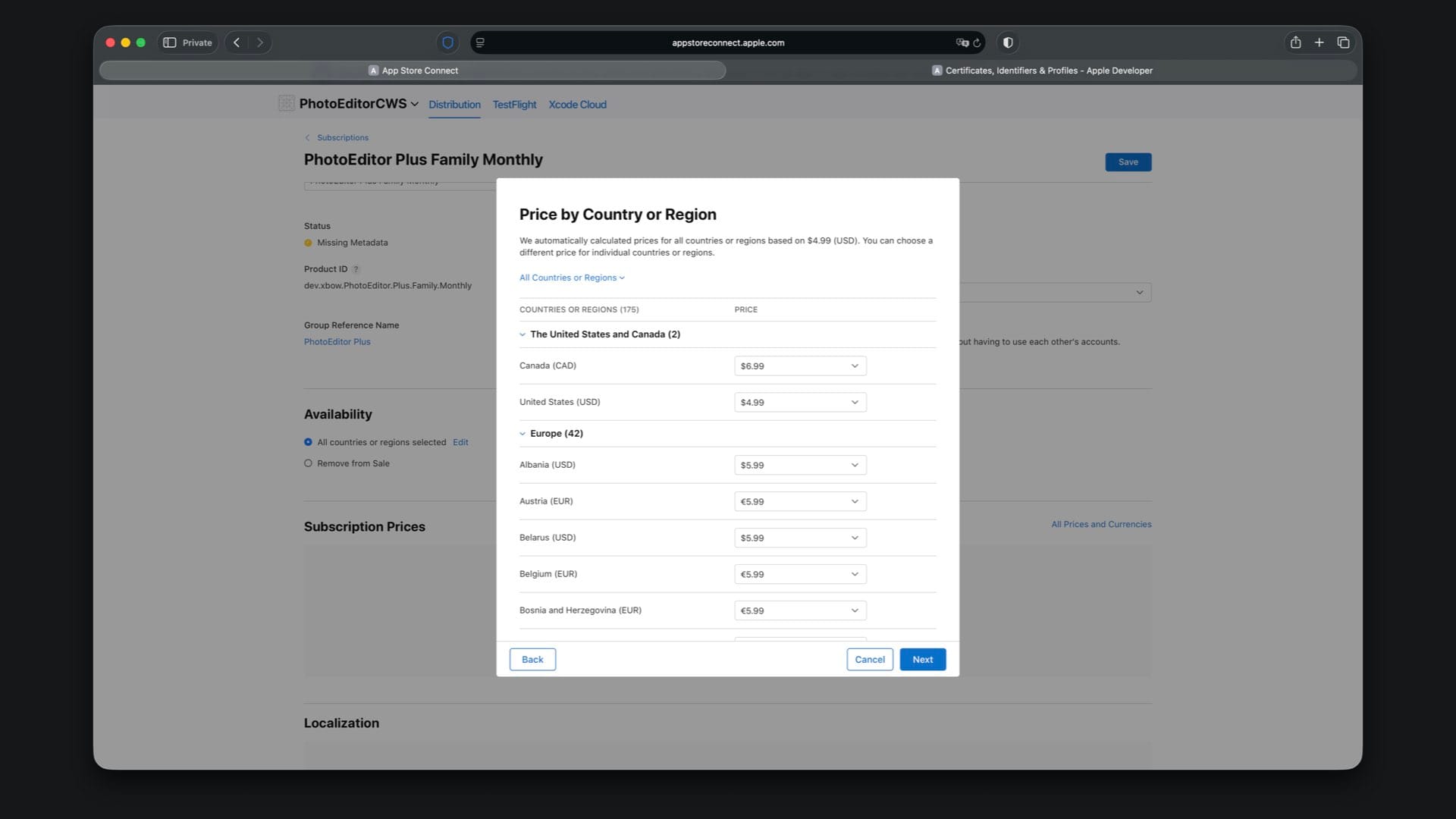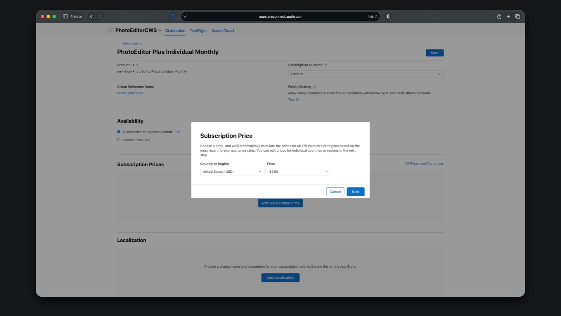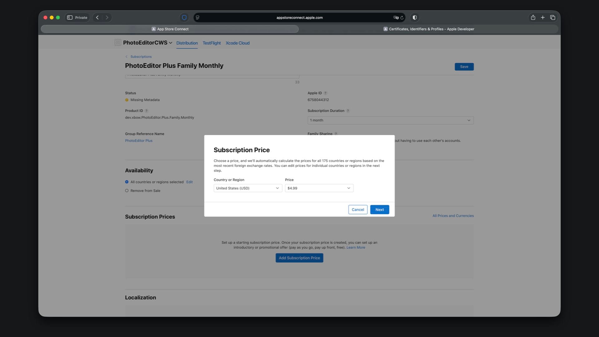 Choose availability, then set the price to match your StoreKit file, for example $4.99 for Family Monthly.