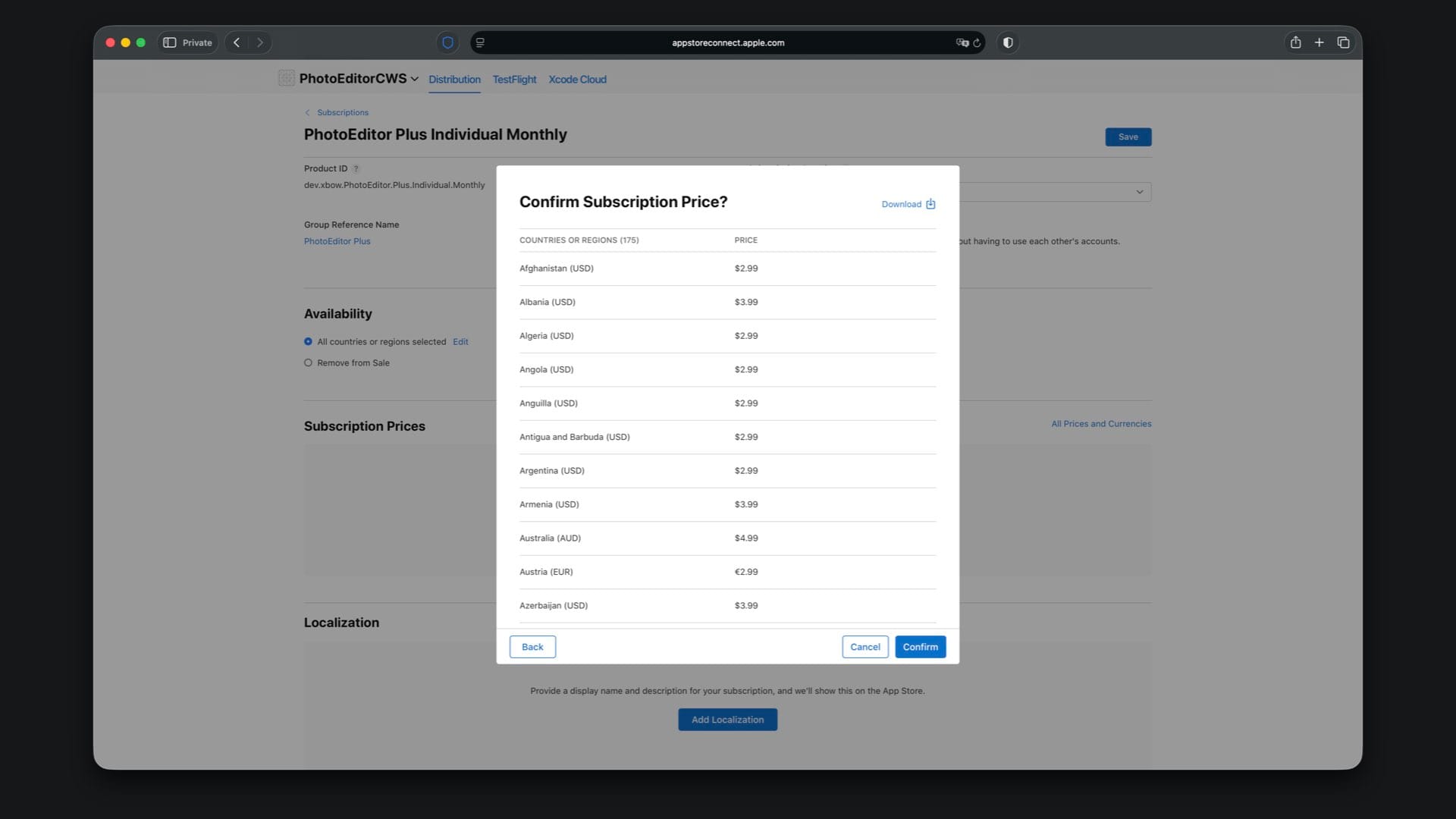 In the “Availability” section, choose the countries or regions where your subscription should be available. You can keep the default selection to make it available in all countries and regions.