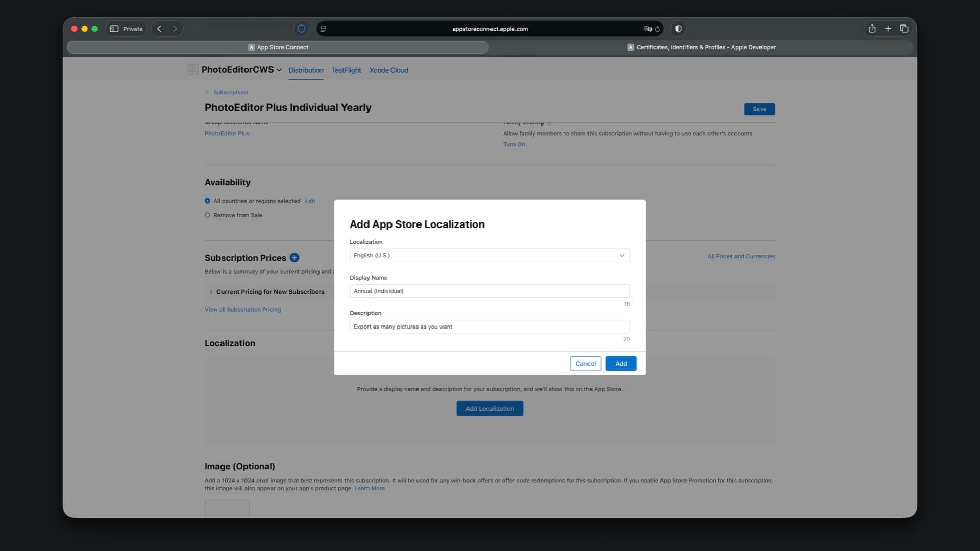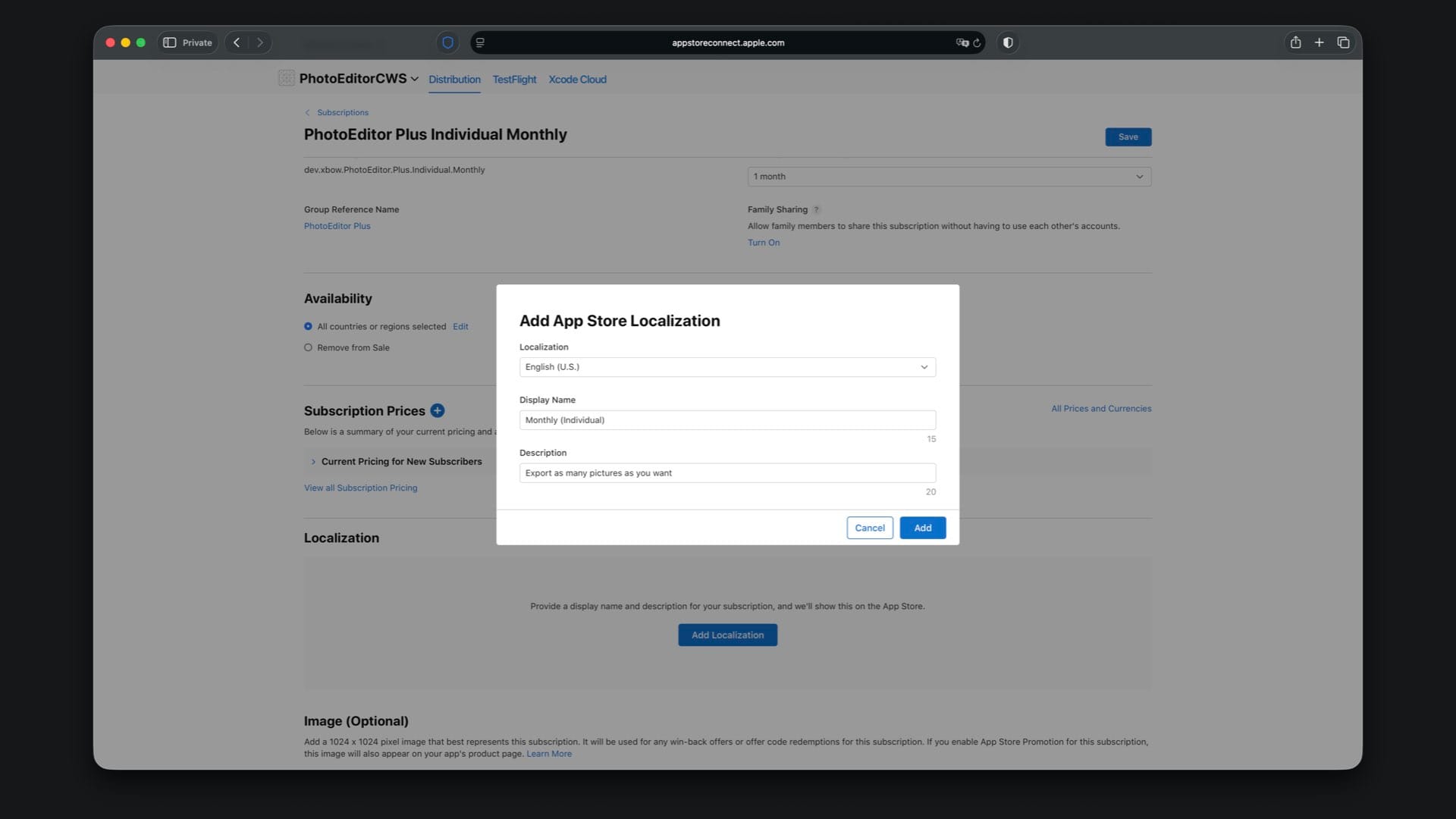 The last step is creating the App Store localization that is shown to users when they view or purchase the subscription. Here you can copy and paste the display name and description from your local StoreKit configuration file, which are “Monthly (Individual)” and “Export as many pictures as you want”.