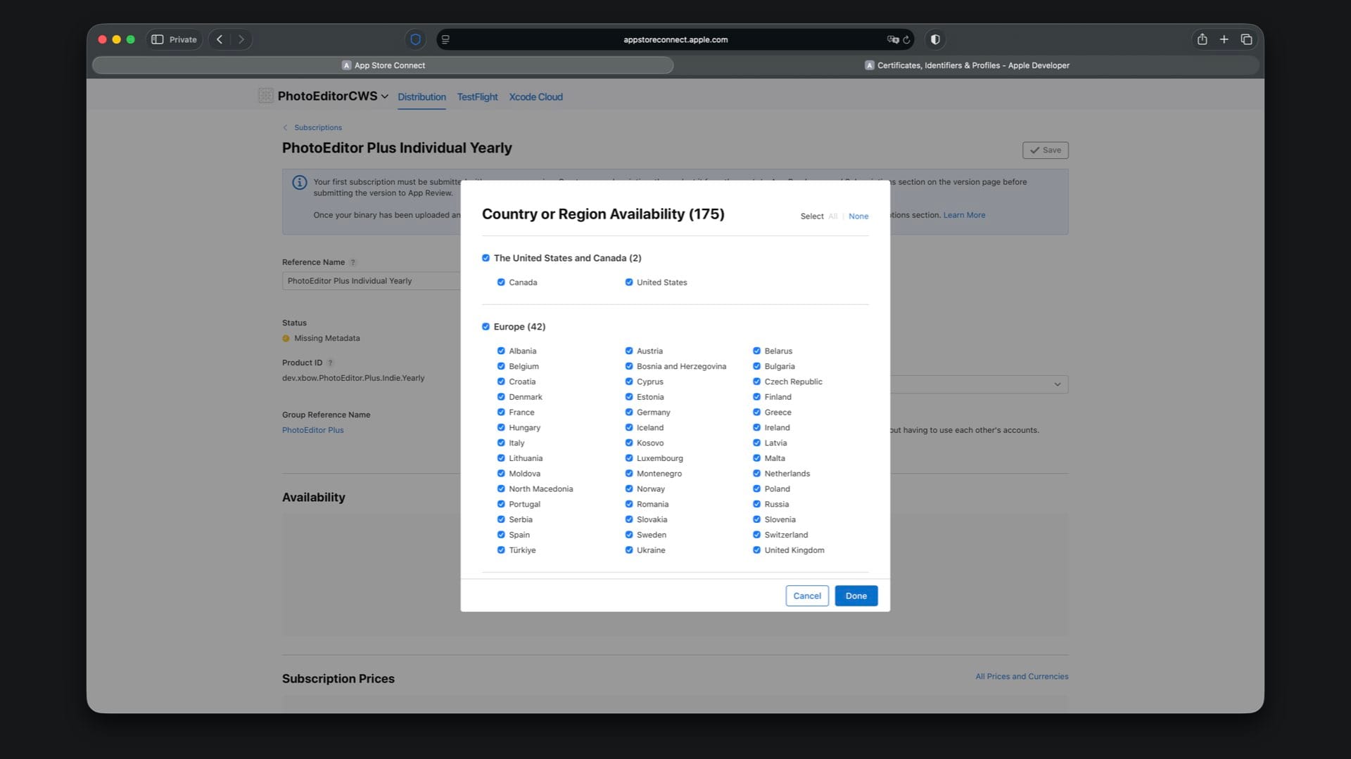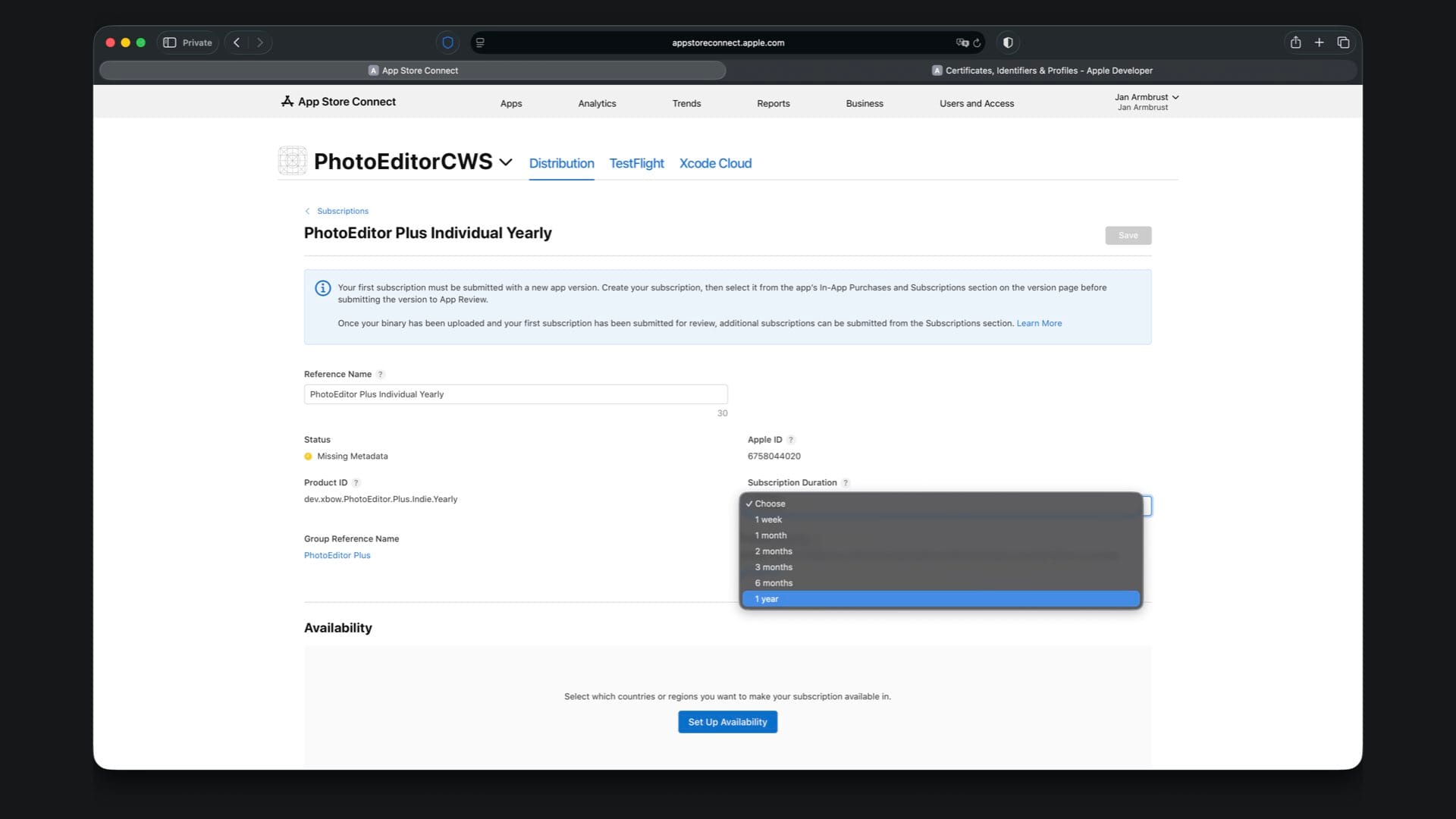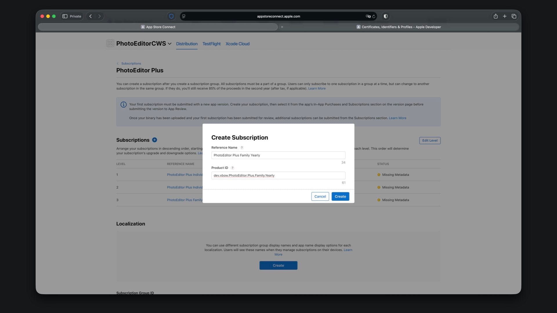 Create “PhotoEditor Plus Individual Yearly” with Product ID suffix .Plus.Individual.Yearly and select a one year duration.