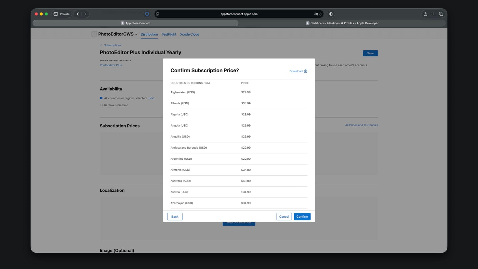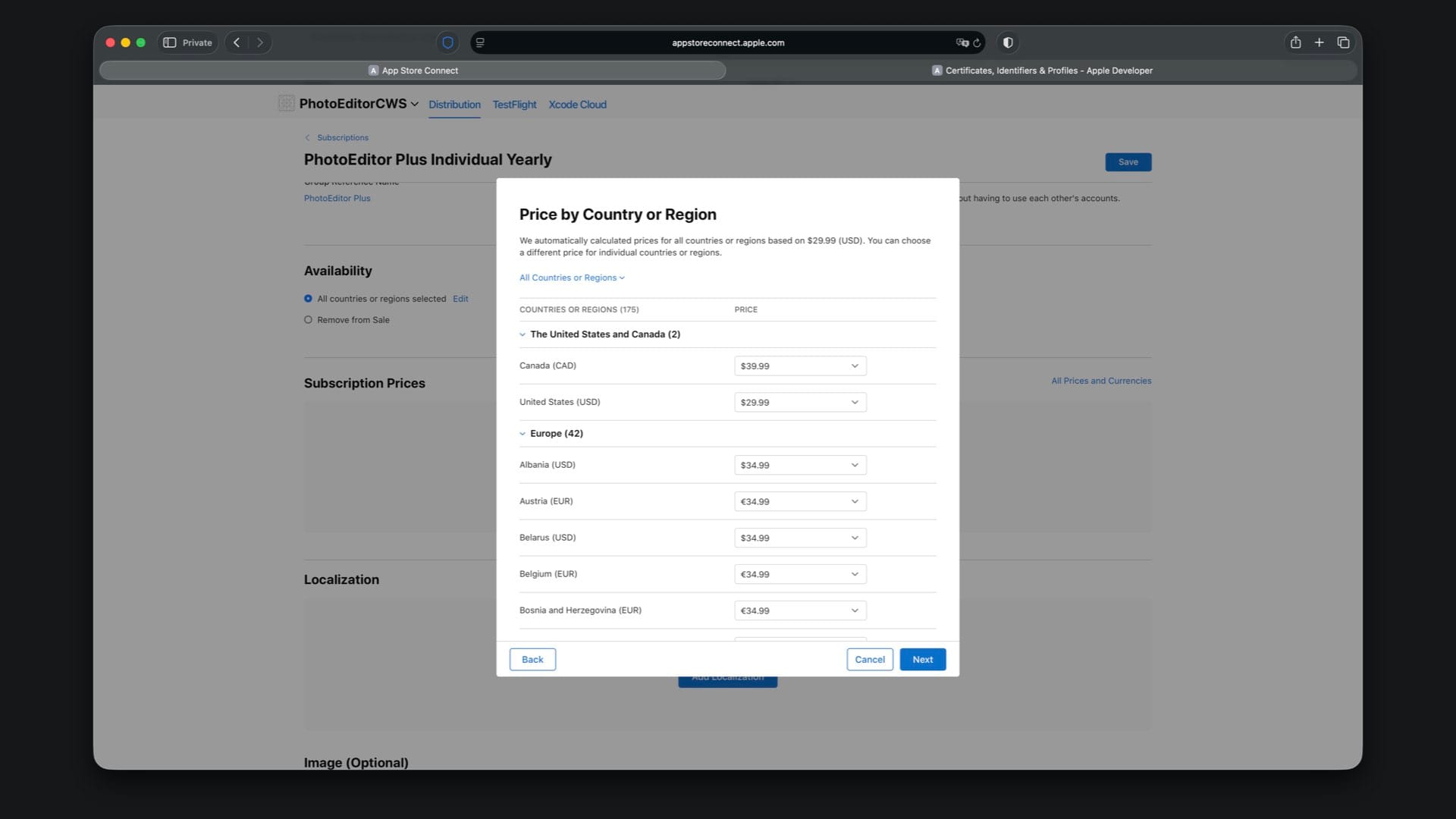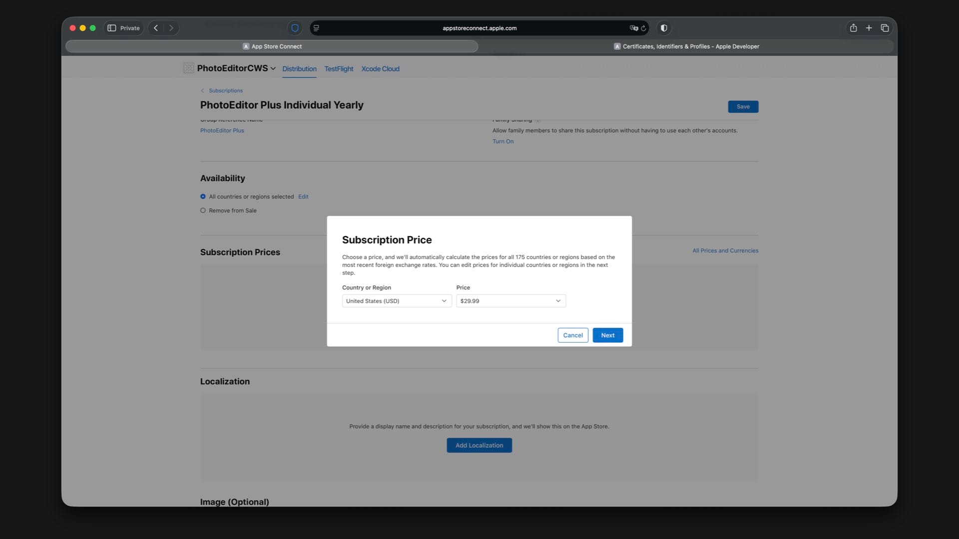 Choose availability, then set the price to match your StoreKit file, for example $29.99 for Individual Yearly.