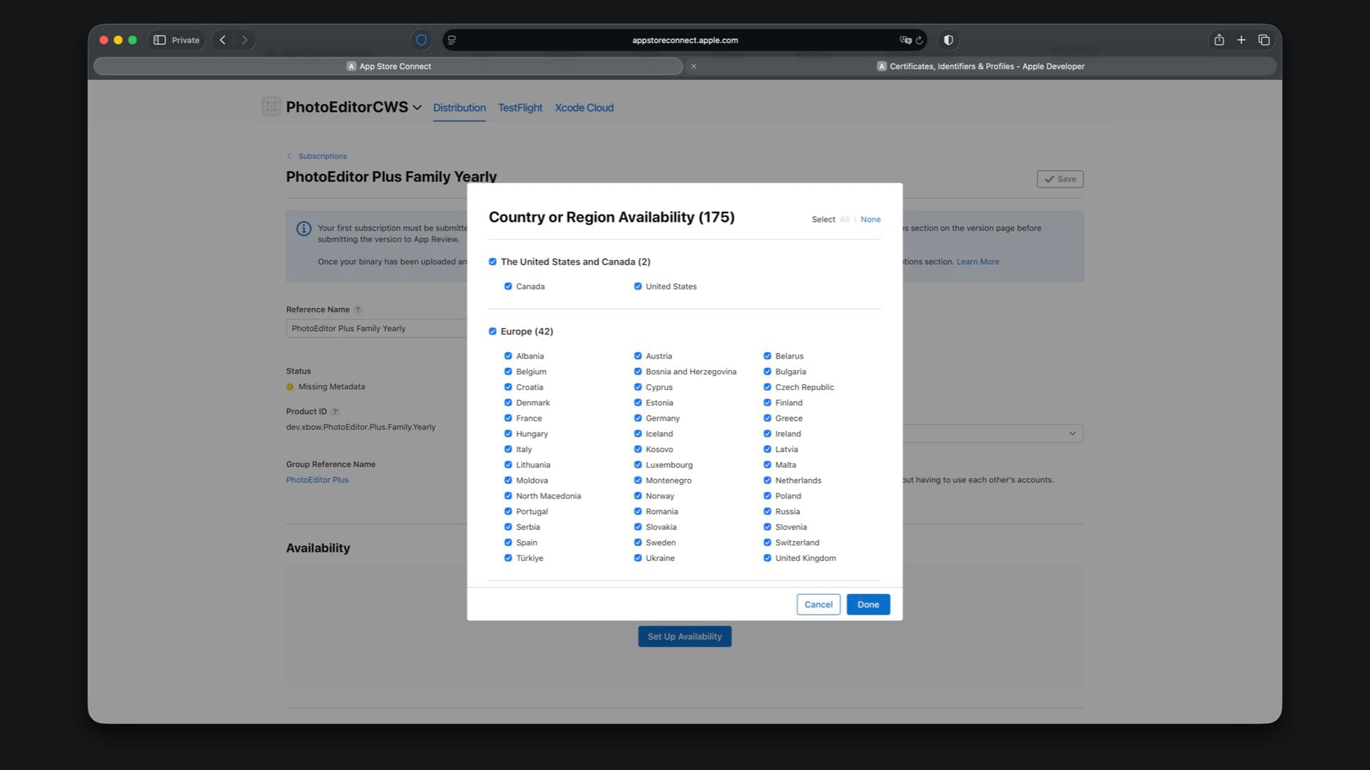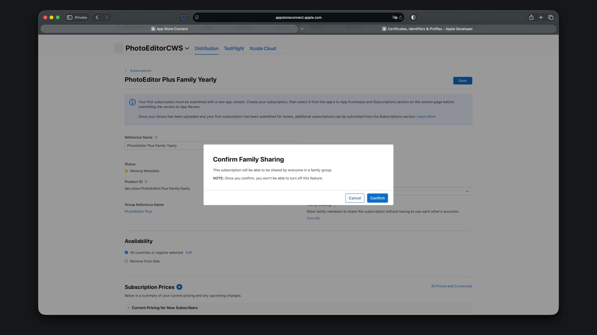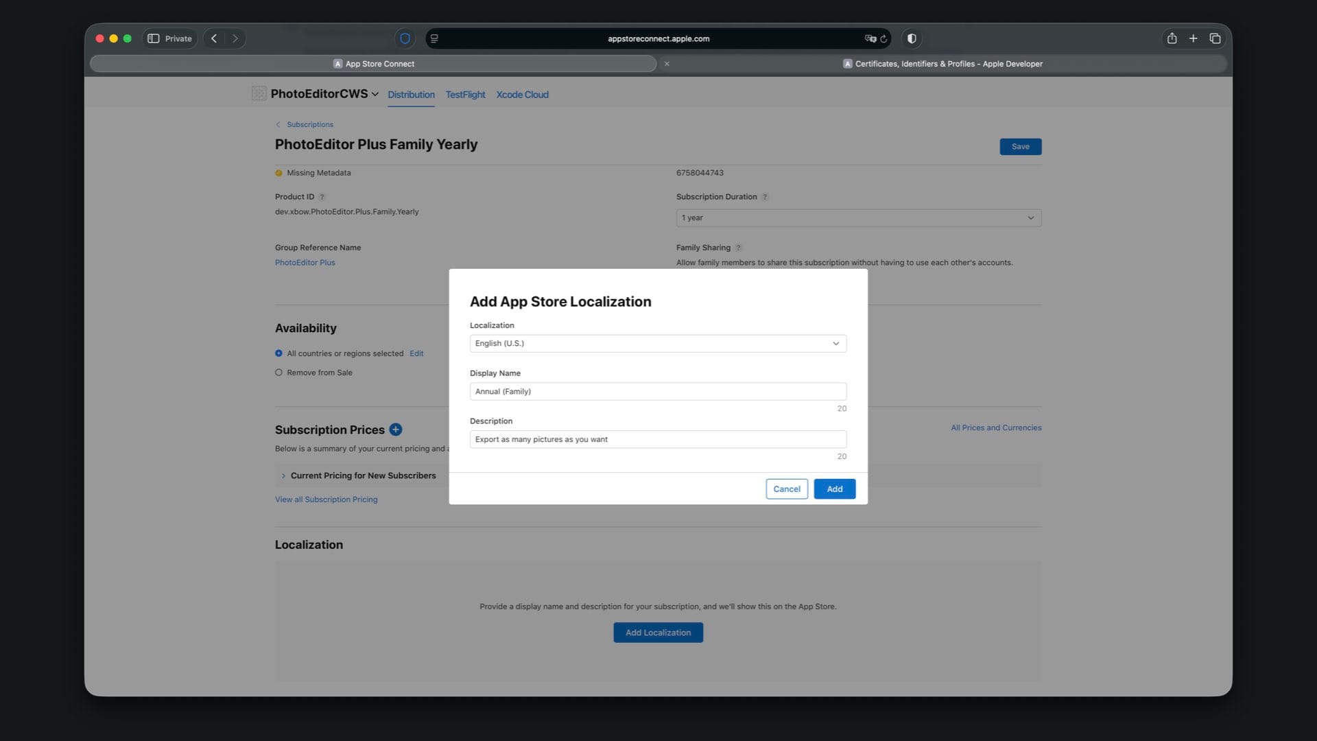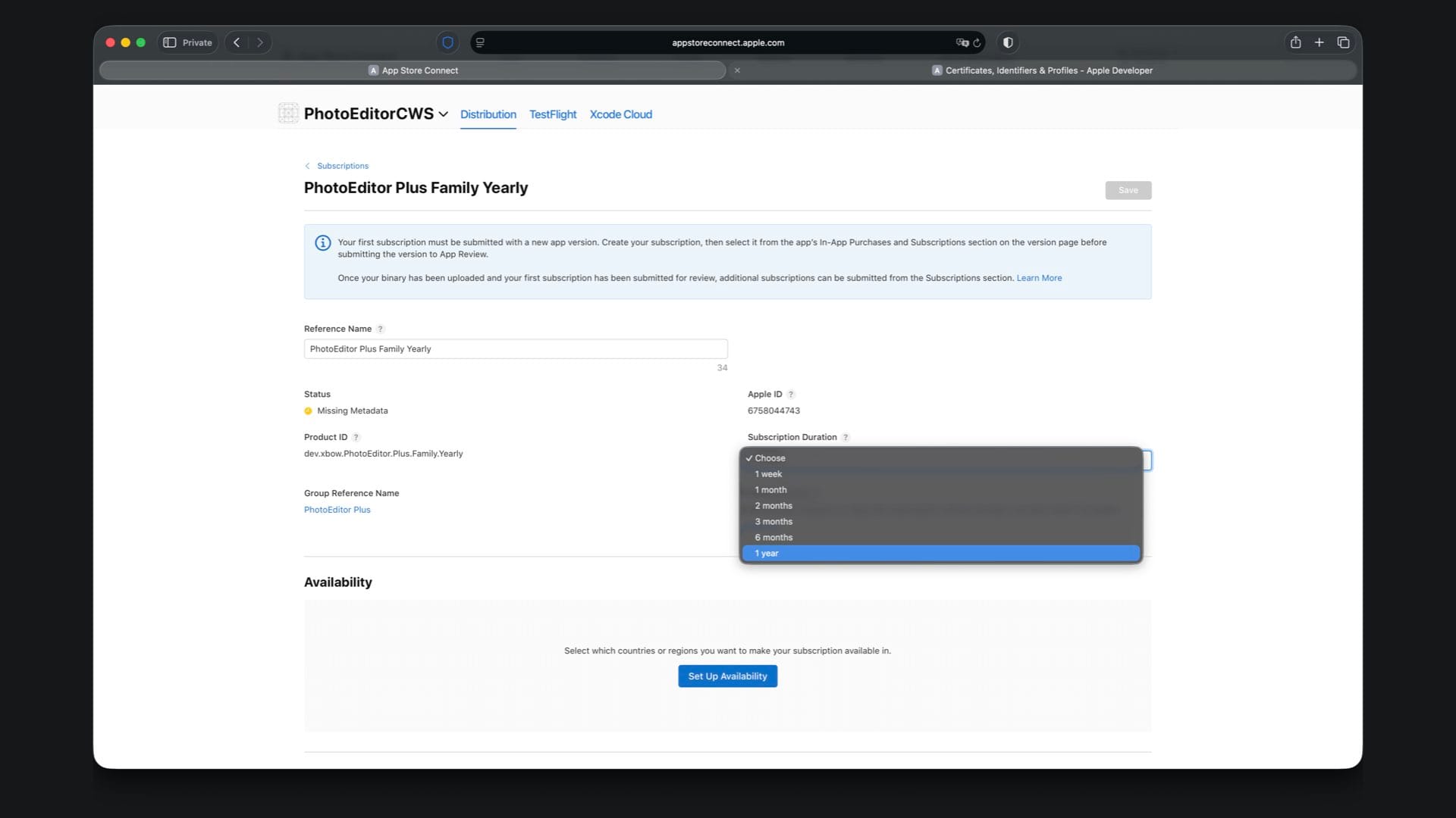 Create “PhotoEditor Plus Family Yearly” with Product ID suffix .Plus.Family.Yearly and select a one year duration.