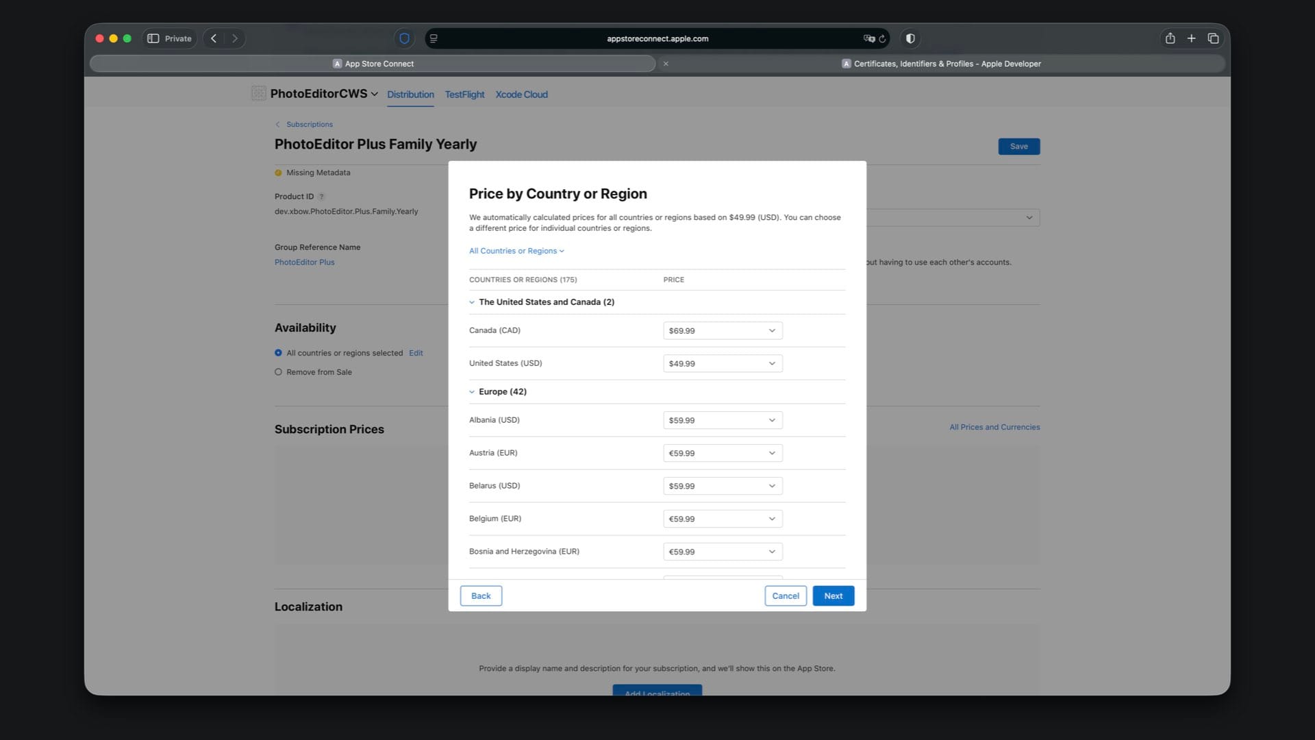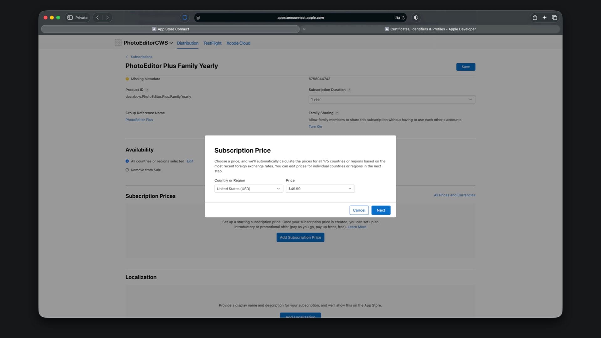 Choose availability, then set the price to match your StoreKit file, for example $49.99 for Family Yearly.