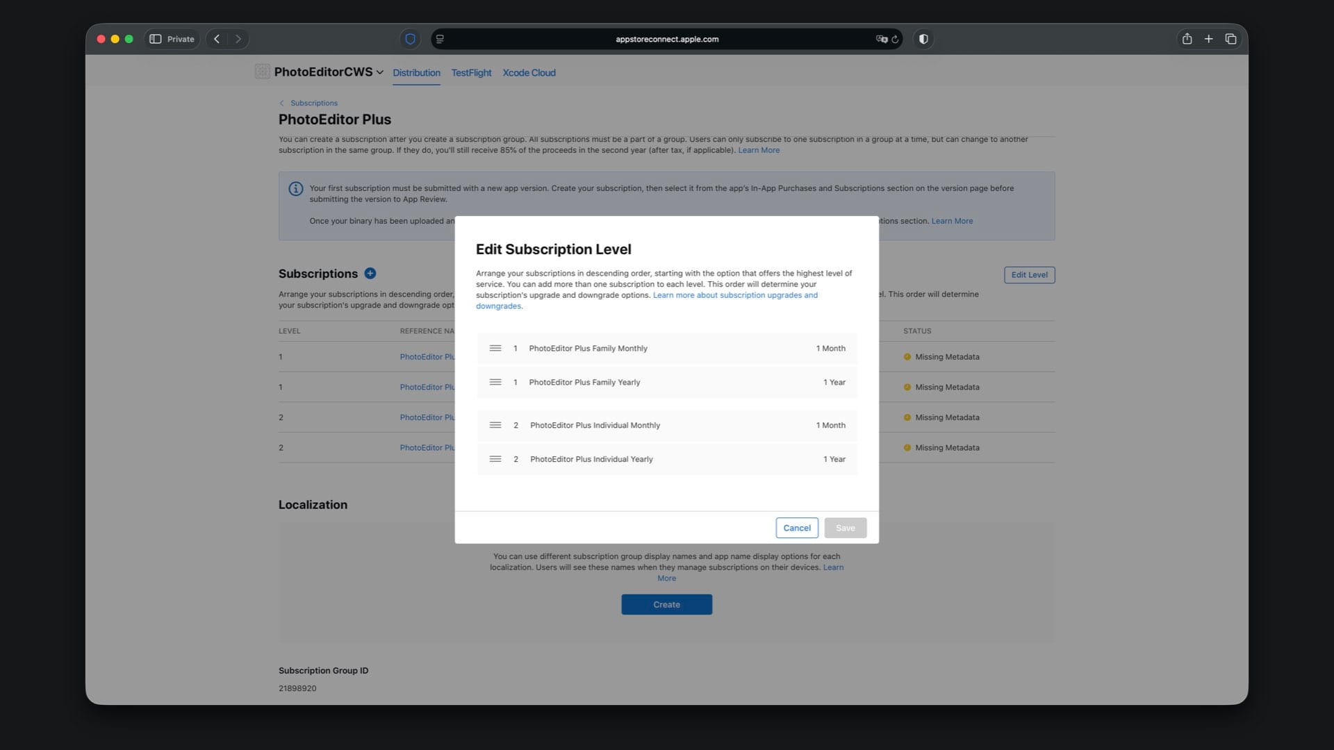 Set the subscription levels so Family is above Individual. In App Store Connect, this is the “Subscription Level” order within the group. It should match the StoreKit configuration, with “PhotoEditor Plus Family Yearly” and “PhotoEditor Plus Family Monthly” as level 1 and “PhotoEditor Plus Individual Yearly” and “PhotoEditor Plus Individual Monthly” as level 2. This is what makes upgrades and downgrades behave correctly.