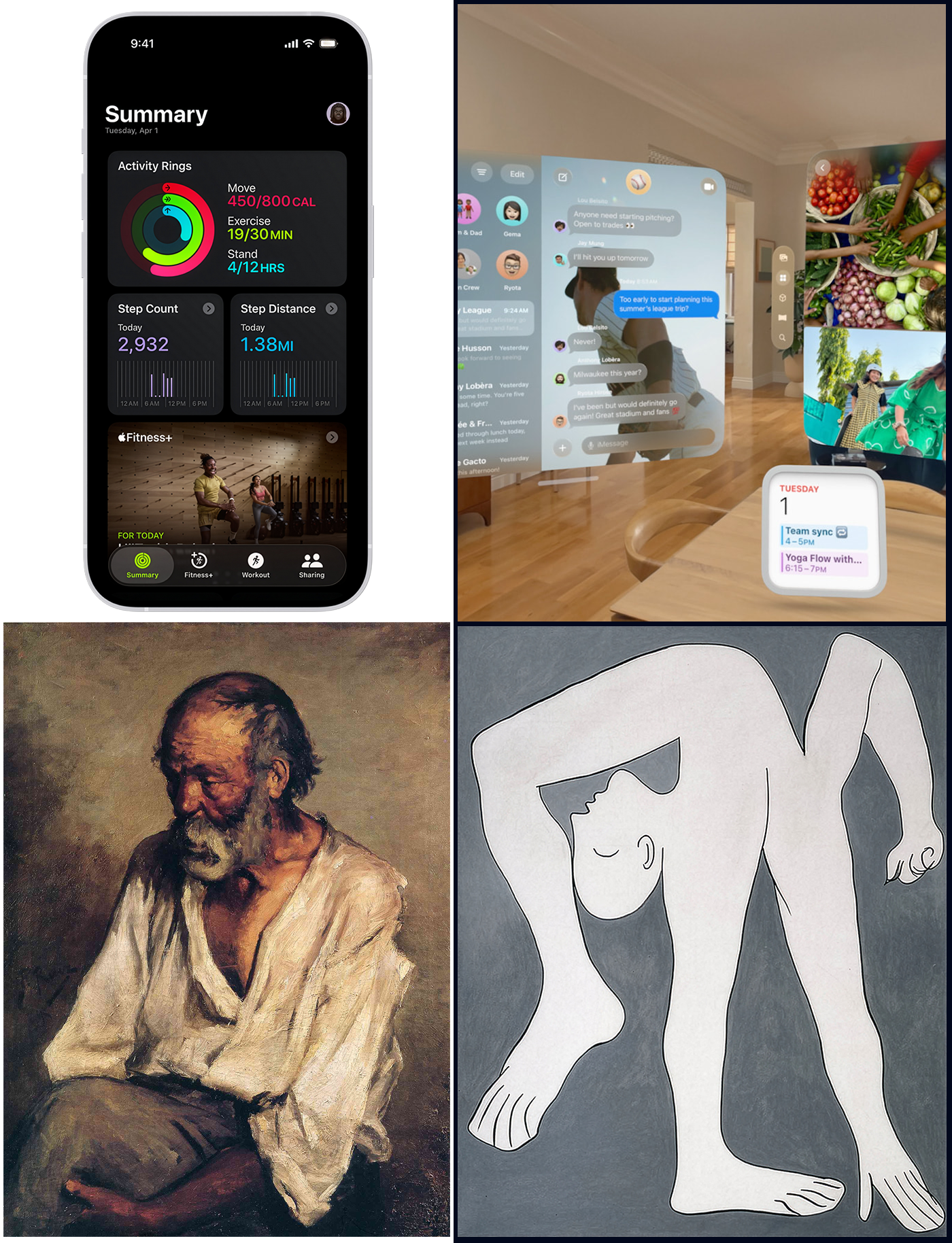 In the following picture, on the left, Pablo Picasso, The Old Fisherman (1895). On the right, still Pablo Picasso, The Acrobat (1930). Picasso’s anatomies embody plasticity: parts can shift, stretch, and relocate without losing identity. Structure is preserved even as form adapts. Traditional iOS layouts resemble a rigid anatomy: fixed, closed to authorship, optimised for repetition, and largely indifferent to body, posture, and context. Their correctness can be verified by coordinates and pixels, because nothing truly moves.