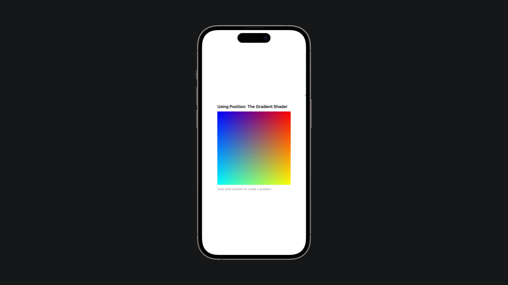 position or currentColor to the shader. SwiftUI provides these automatically. The ShaderLibrary.basicColor() call creates a Shader object that SwiftUI knows how to execute.Using Position: The Gradient Shader